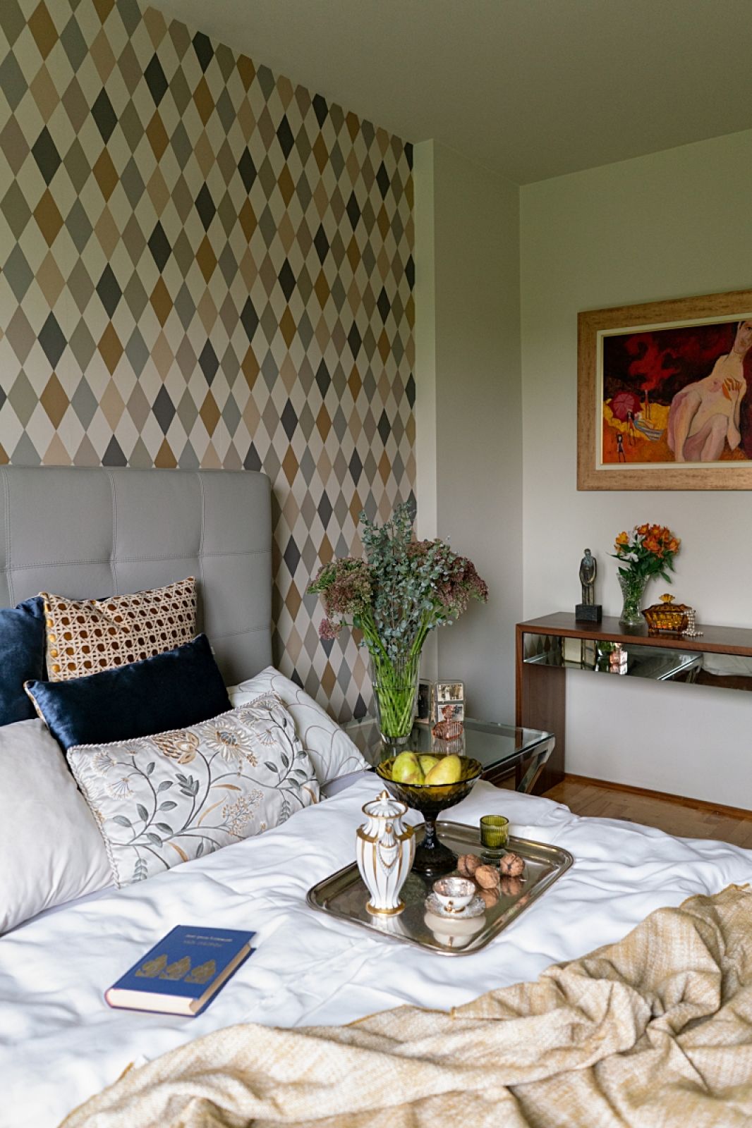 Następnym pomieszczeniem, które zaprojektowała Małgorzata Bacik była sypialnia. Projekt tego wnętrza powstał 10 lat temu, ale przestrzeń do dziś zachwyca swoją wyrafinowaną elegancją. Wnętrze miało być spokojnie, wygodne i nieco romantyczne – idealne do relaksu. Stanęły w nim duże komfortowe łóżko (Bo Concept), eleganckie stoliki nocne (Eichholtz) oraz toaletka dla pani domu. Uwagę przyciąga tapeta na ścianie za łóżkiem (Cole & Son). Jest wzorzysta, ale w stonowanych kolorach, które dodają wnętrzu charakteru i miło ocieplają pokój.