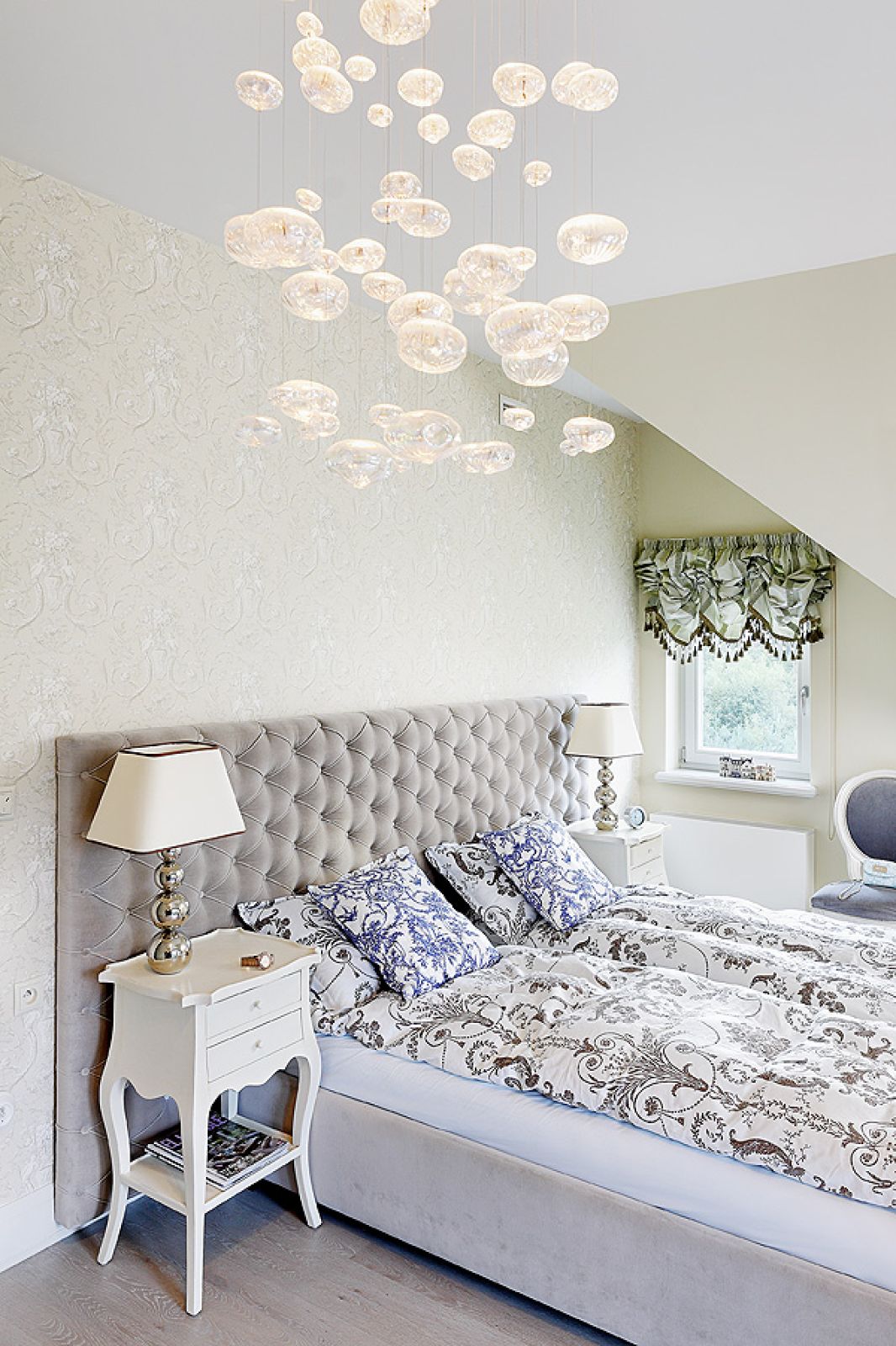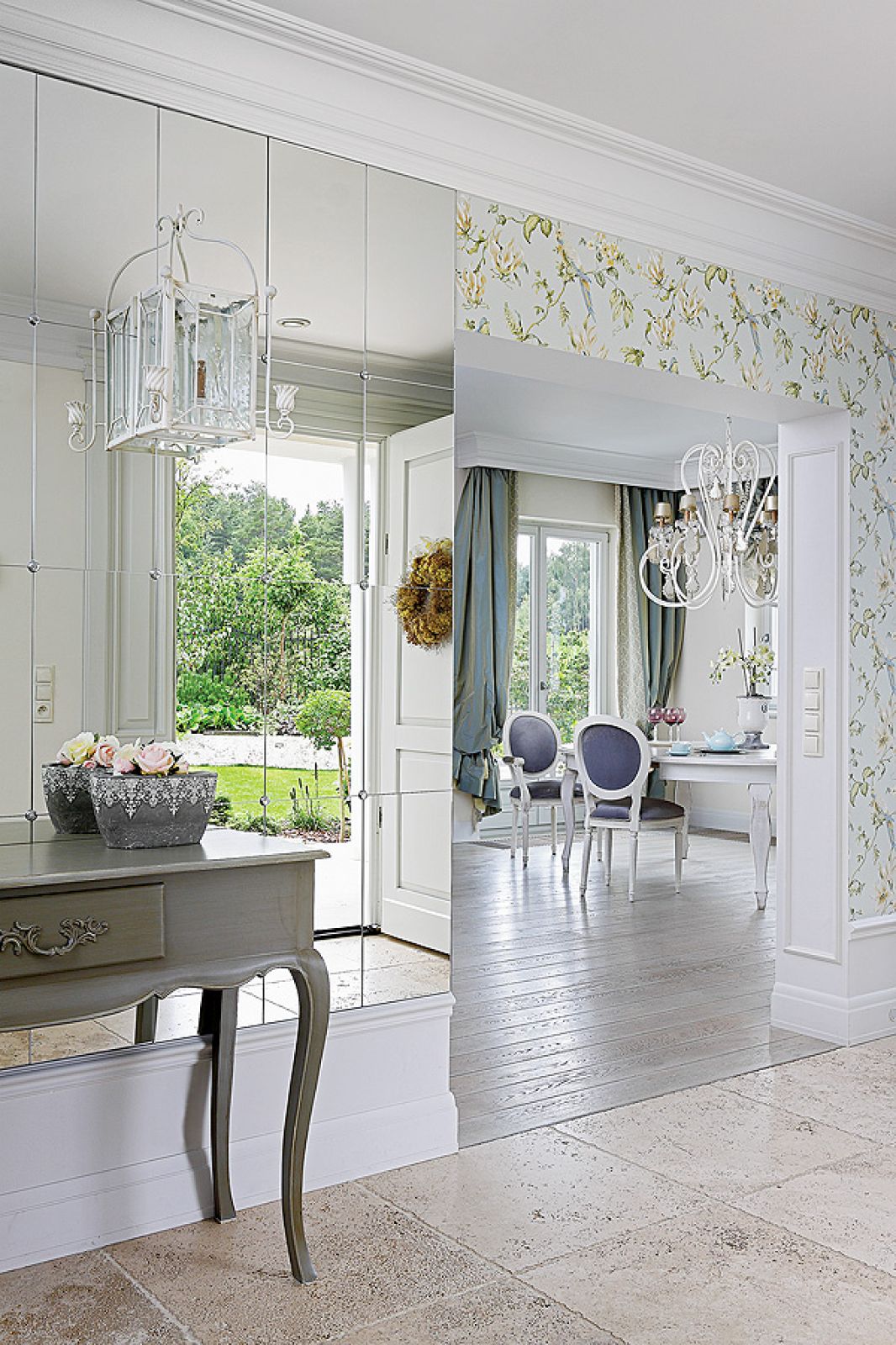 Francuski żyrandol i ściany wykończone płatkami srebra