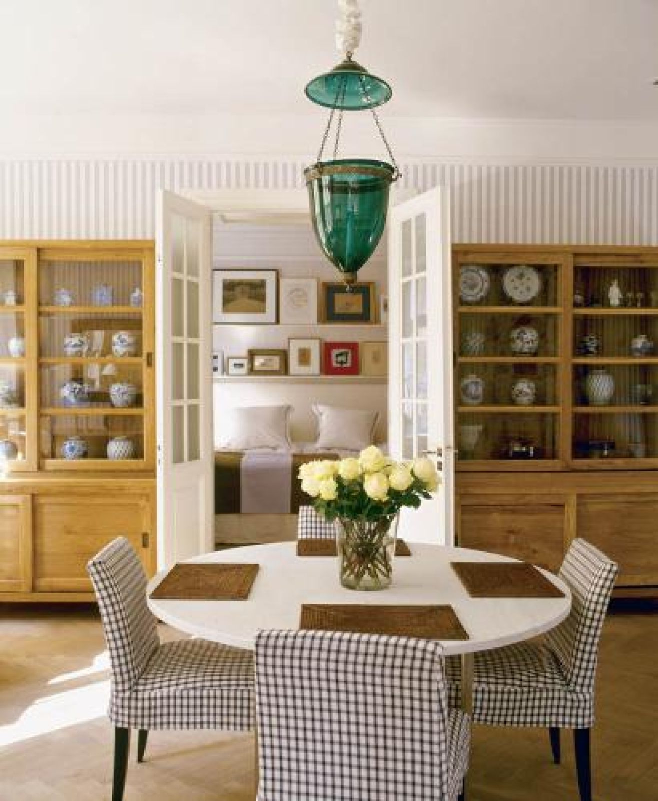 W bawialni, na parapecie dumnie prezentuje się kolekcja egzotycznych bibelotów. Etniczną nutę podkreślają współczesne drewniane stoliki kawowe i oryginalny chiński stół z XIX wieku z marmurowym blatem. W jadalni, w witrynach można z kolei podziwiać starą biało-niebieską chińską porcelanę. Do tych waz, mis, wazonów, talerzy Ulla i Lars mają szczególną słabość.
