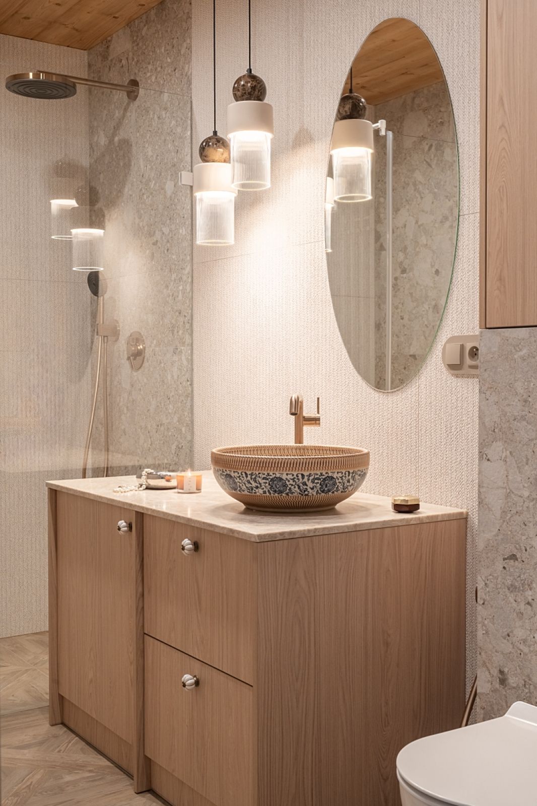 Jasna paleta kolorystyczna stanowi jeden z kluczowych elementów projektu. Beże, ciepłe szarości i naturalne odcienie drewna tworzą spójną, wyciszającą kompozycję, która pozwala odetchnąć i zwolnić tempo. To kolorystyka przemyślana – unika zarówno sterylnej bieli, jak i przytłaczających ciemnych tonów.