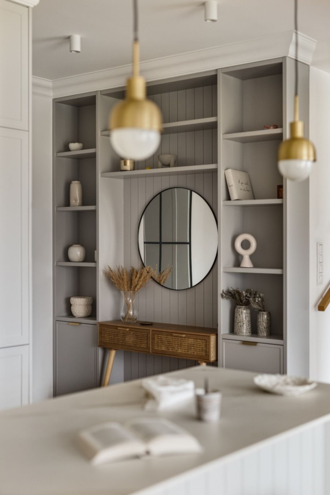 Nad półwyspem zawisły mosiężne lampy, które odbijają się w okrągłym lustrze na wprost kuchni. Od strony jadalni projektantki postawiły na pionowe nafrezowania w mdfie, który nawiązują one do współczesnego motywu boazerii. Przy półwyspie stanęły również proste w formie hokery z litego drewna.