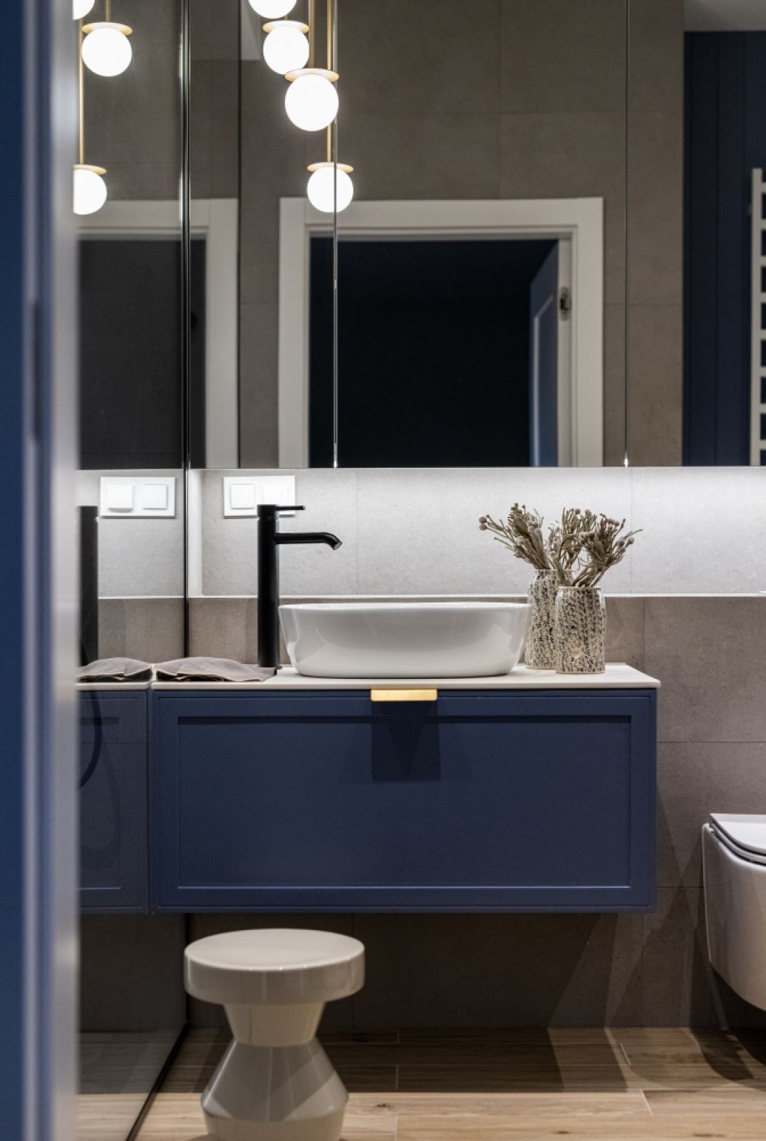 – Druga łazienka została zaprojektowana z myślą o pogodzeniu potrzeb wszystkich domowników. Miałyśmy do czynienia z odwiecznym dylematem – wanna czy prysznic? Nasi inwestorzy nie chcieli z niczego rezygnować. Po kilku przymiarkach udało się przesunąć ścianę, aby zrobić miejsce na wolnostojącą wannę. W efekcie pralka i suszarka znalazły się w zabudowie meblowej na korytarzu, gdzie dodatkowo zorganizowałyśmy miejsce na przechowywanie domowej chemii oraz kosze na pranie – opowiadają projektantki. Lustrzane fronty w łazience, za którymi ukryto pozostałe kosmetyki, optycznie powiększają przestrzeń. Kameralne oświetlenie oraz naturalne faktury płytek dodały wnętrzu przytulności.