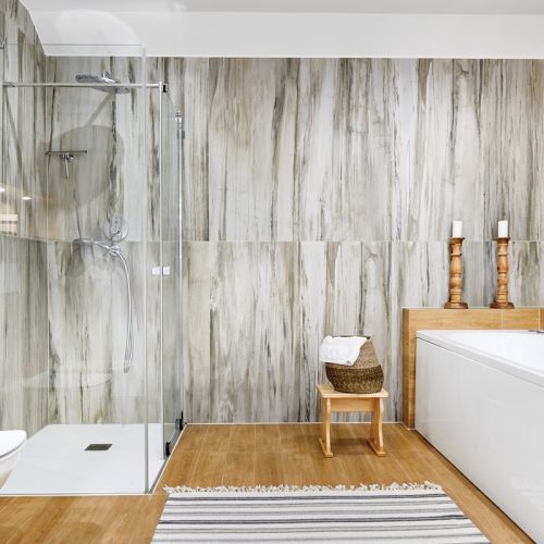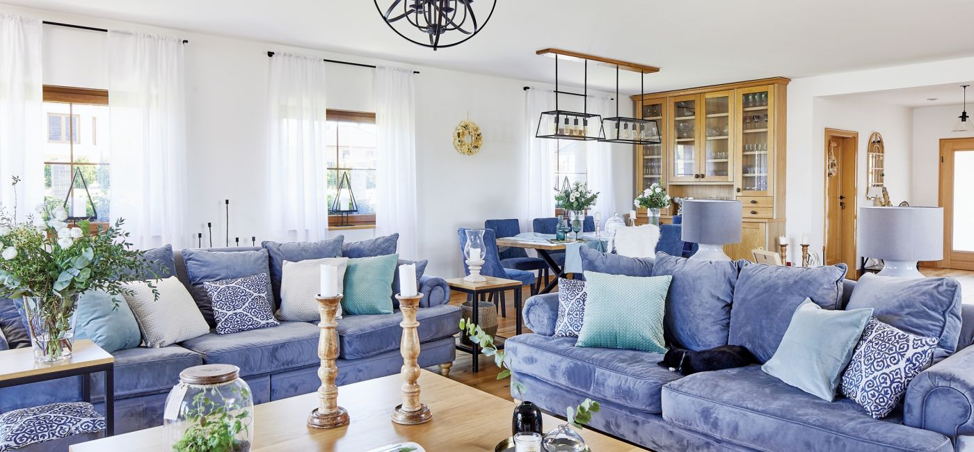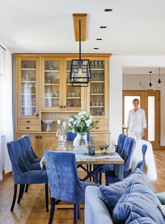 Drewno i niebieskie dodatki w klasycznych wnętrzach