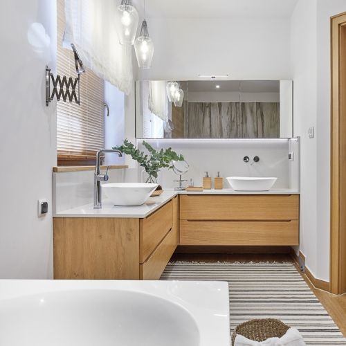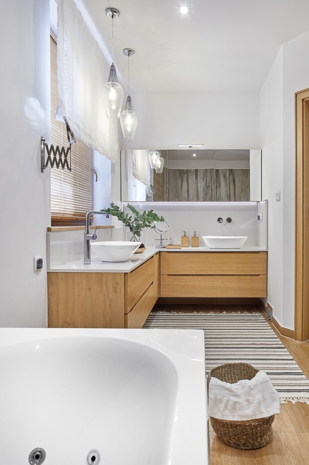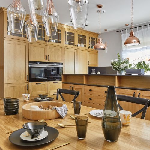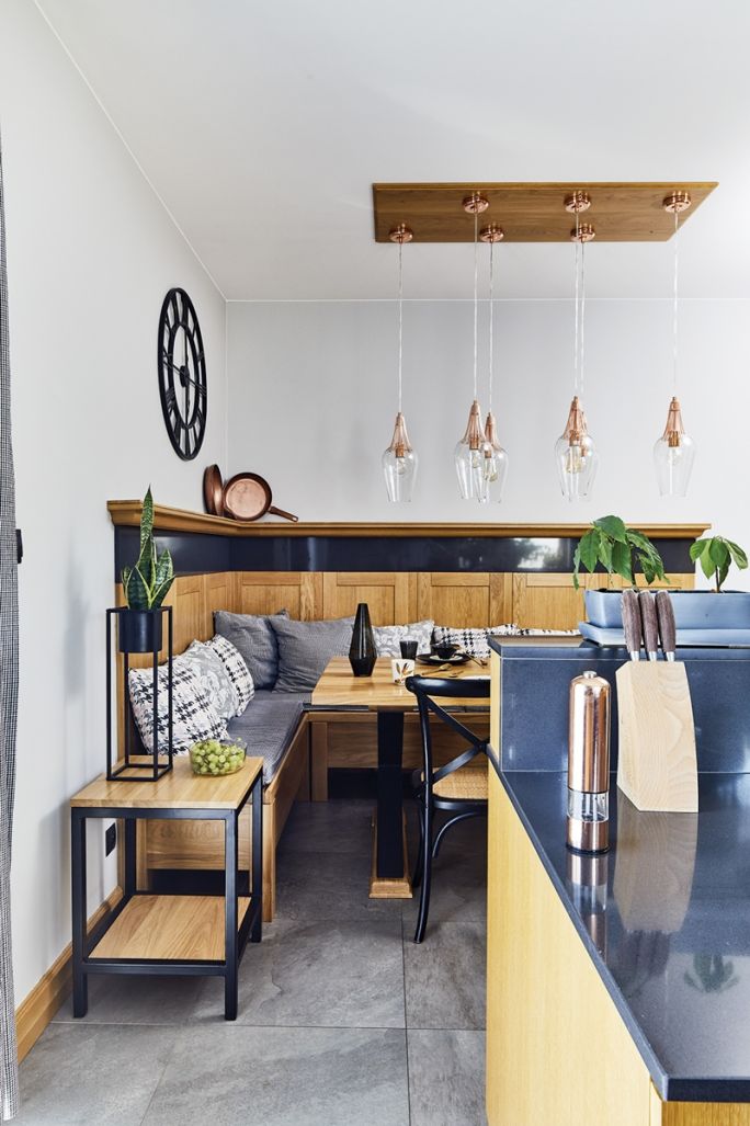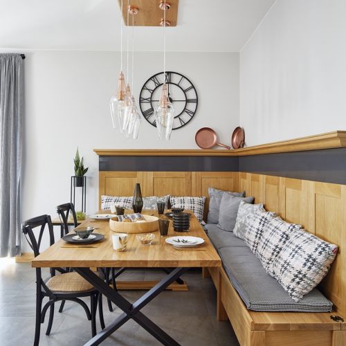 – Zaproponowałam obudowanie jej wysokimi szafkami, w których znalazło się miejsce na zastawę stołową. By nie tracić przestrzeni, tradycyjne krzesła zastąpiłam narożną ławą. Z kolei stolarz podpowiedział, że mógłby zrobić dębową maskownicę dla lamp wiszących nad stołem. Dzięki temu seria pojedynczych, zamocowanych obok siebie lampek wygląda jak jeden duży żyrandol. Obawiał się z kolei schodów, bo są nietypowe, ale przekonaliśmy go argumentem, że będzie miał bogatsze portfolio – wspomina z uśmiechem Beata.