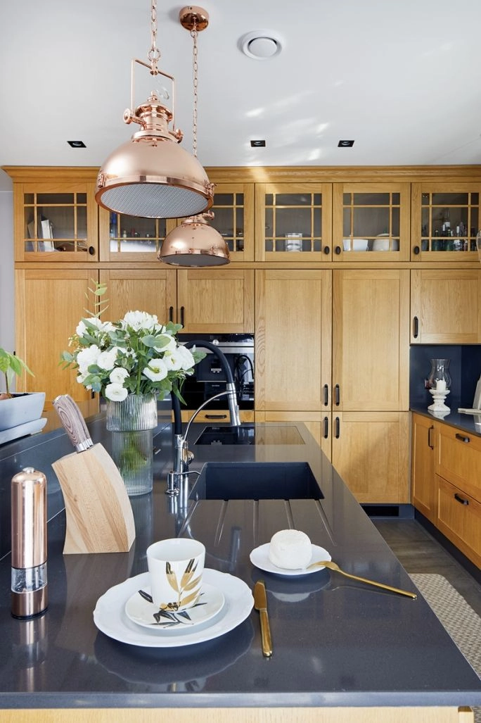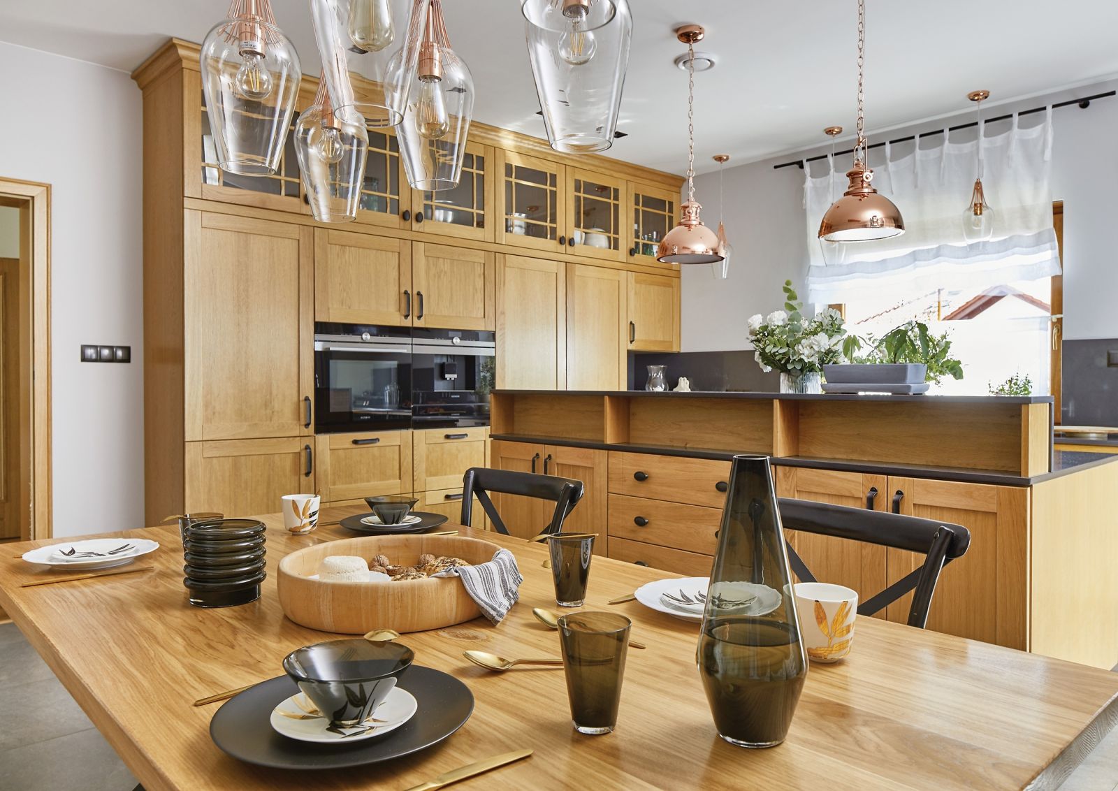 Kuchnia w drewnie – wysokie szafki, wyspa i wygodna ława
