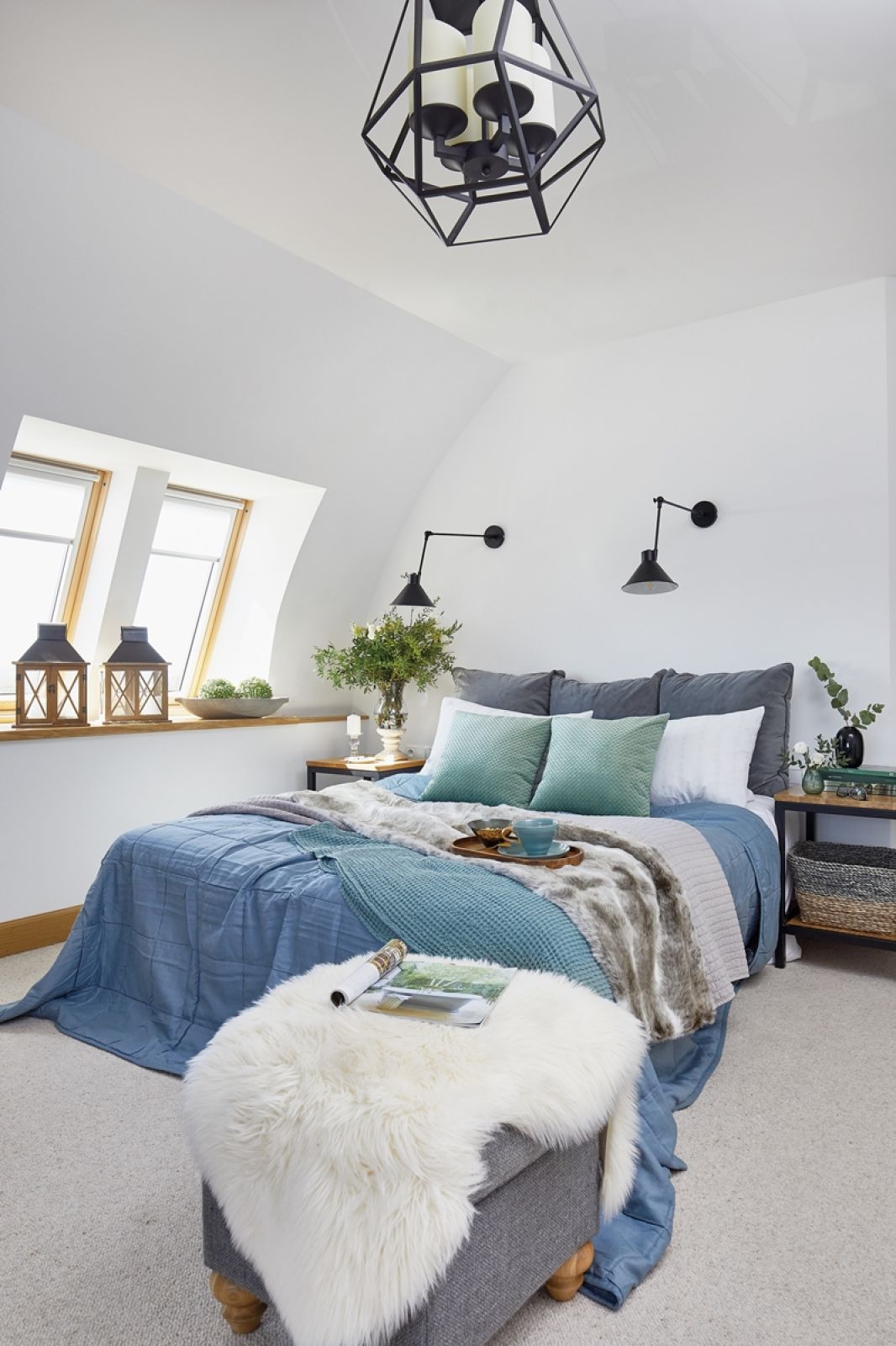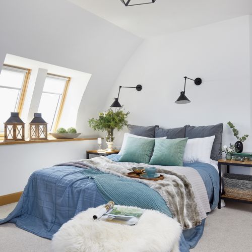 Przytulne, klasyczne wnętrza z drewnem i niebieskimi dodatkami