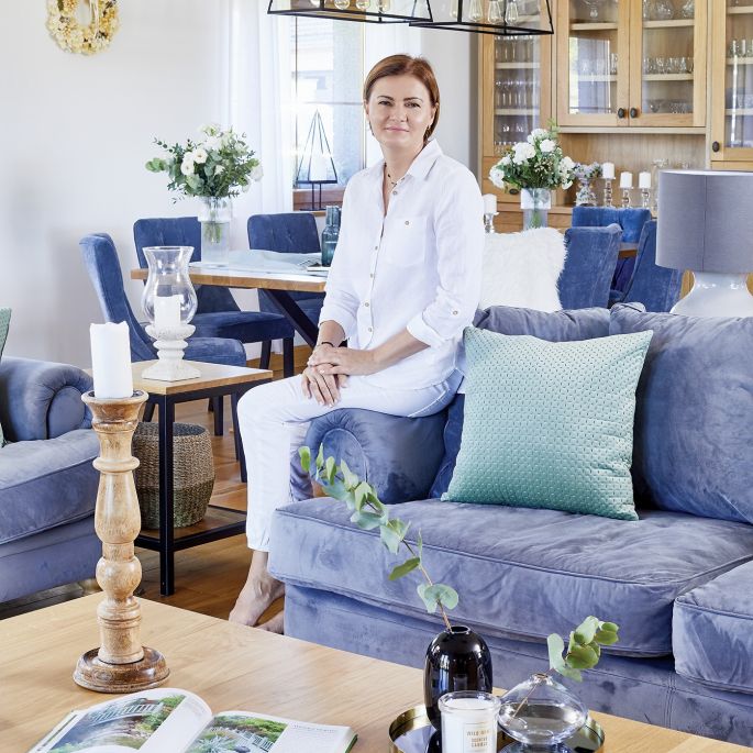 Poprzedni dom urządzony był nowocześnie i minimalistycznie, miał duże okna. Jasną, otwartą przestrzeń wypełniały meble o prostych liniach i gładkich frontach. Gdy kilka lat temu postanowili wrócić do rodzinnej Jeleniej Góry, Monika wiedziała, że ich nowe miejsce będzie ciepłe, klasyczne, pełne naturalnych materiałów. W czasie przeprowadzki zabrali ze sobą tylko pamiątki, ubrania i sprzęt sportowy. Całą resztę stworzyli od nowa. Poszło im tak dobrze, jak w tańcu.