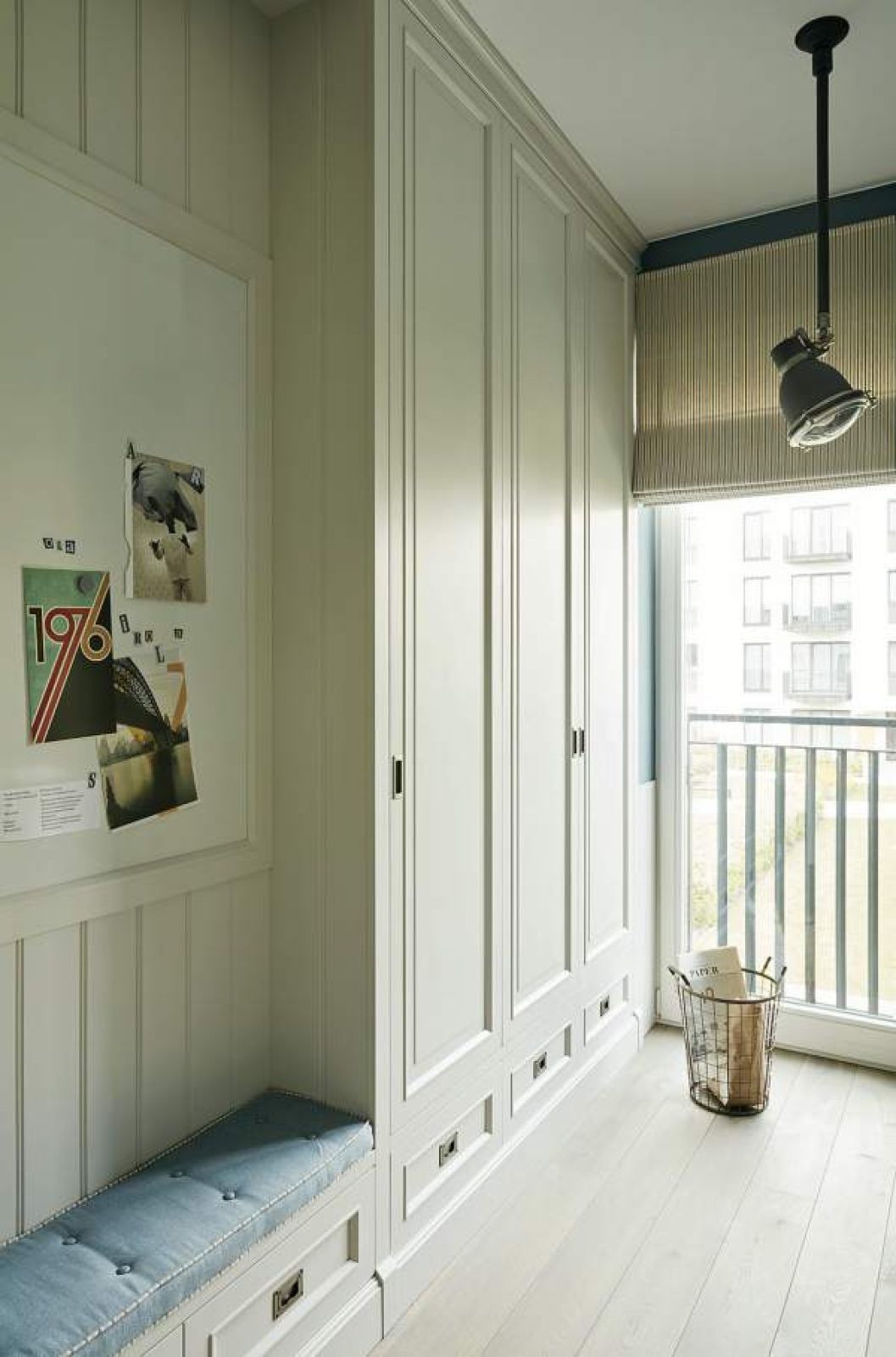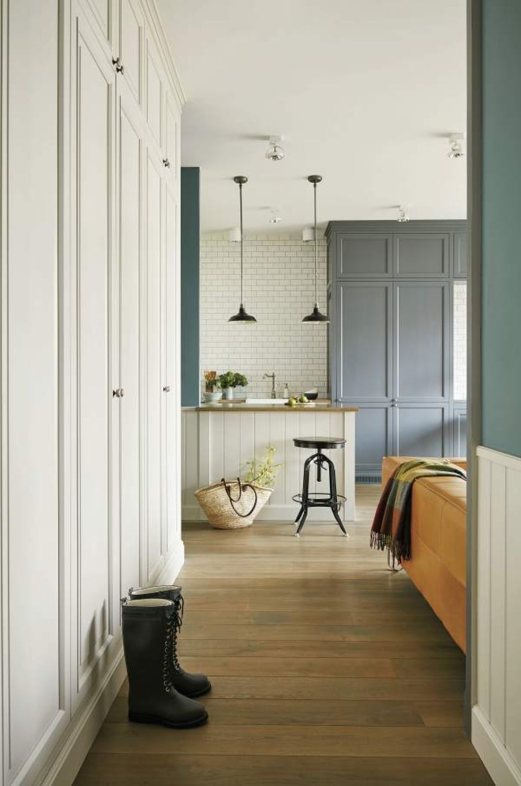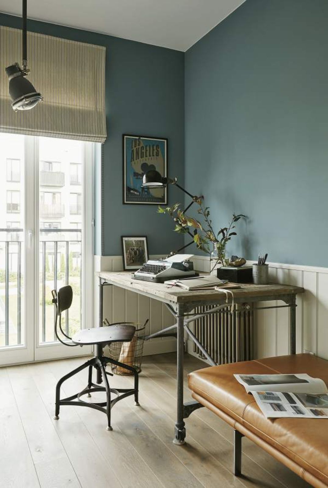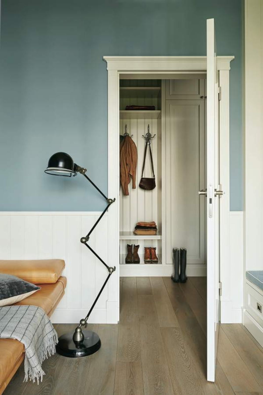 Justyna dokładnie wie, czego chce, i jest wytrwała zarówno podczas robienia filmów, jak i urządzania domu. – Potrafię godzinami wybierać kolory i szukać odpowiedniego odcienia – opowiada. Ciemne niebieskości i grafit od dawna chodziły jej po głowie. Wystarczy popatrzeć na większość szaf w salonie, ściany w holu i meble w sypialni. Ciekawy kolor ma też drewniana podłoga, łączona z szaro-niebieskimi płytkami. – Jest w niej coś z sera pleśniowego – śmieje się Justyna. Całość rozjaśniła bladą szarością drzwi, szaf, obudowy kaloryferów i białymi płytkami na ścianach. Wystrój wnętrza zaplanowała, zanim jeszcze odebrała klucze.