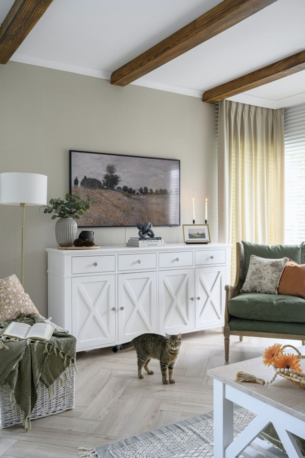 W salonie stanęła drewniana komoda z ramiakami na frontach, przy narożniku duża ława... z tajną szufladką. – Często gramy tu z naszą córeczką w planszówki, układamy puzzle, a po skończonej zabawie Laura otwiera szufladkę i zgarnia do niej „bałagan”. W ten sposób udajemy, że zawsze mamy porządek – śmieje się właścicielka.
