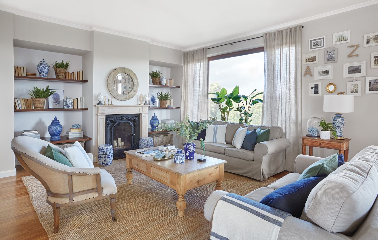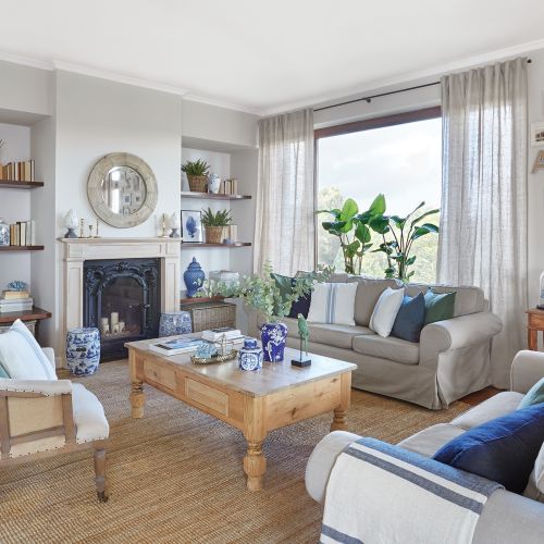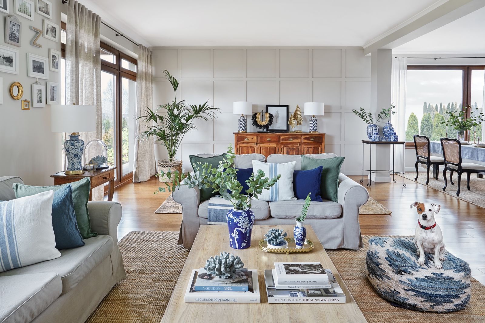 Dom w stylu hampton z rustykalnymi akcentami, dywanami z sizalu i talerzami od Fornasettiego