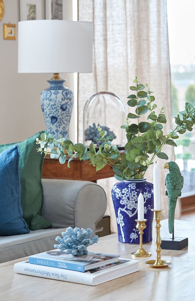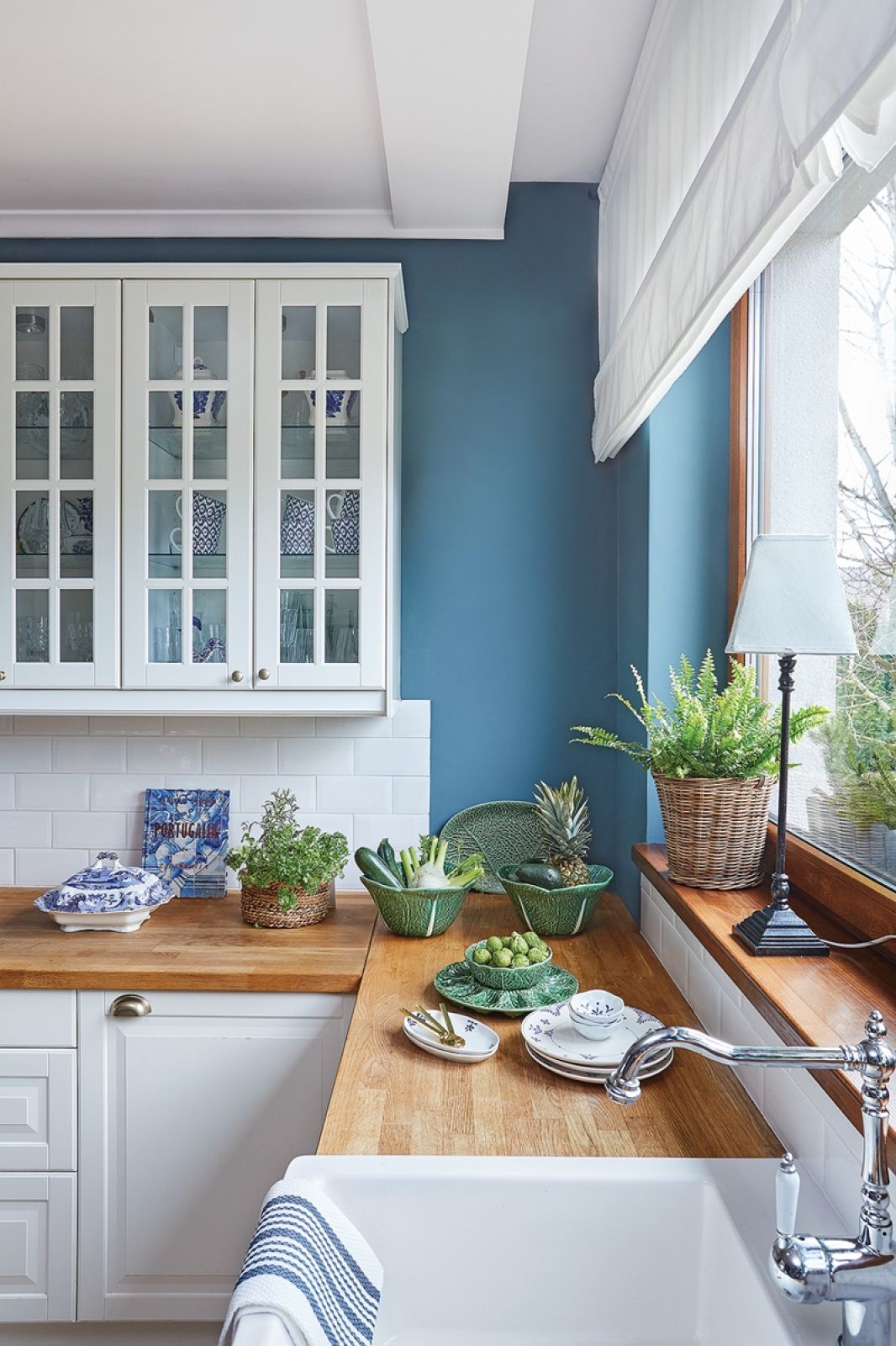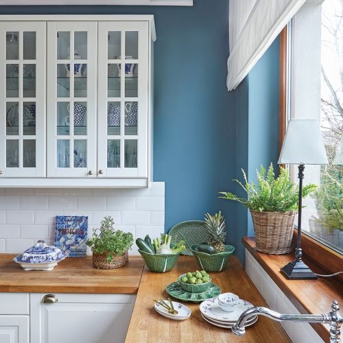 Jako ostatni dołączył kolor niebieski. A zaczęło się od pięknej biało-niebieskiej wazy z Jarmarku Dominikańskiego. Tak ją zachwyciła, że rozemocjonowana, targując się o cenę, zapłaciła więcej, niż chciał sprzedawca na początku. Ale nie żałuje, bo był to początek ceramicznej kolekcji. Biało-niebieską porcelanę pokochała jeszcze bardziej po wyjazdach do ulubionej Portugalii, słynnej z azulejos w tych kolorach. Jedną z waz, białą, upolowaną za grosze w hurtowni gastronomicznej – sama nawet pomalowała błękitnymi farbami.