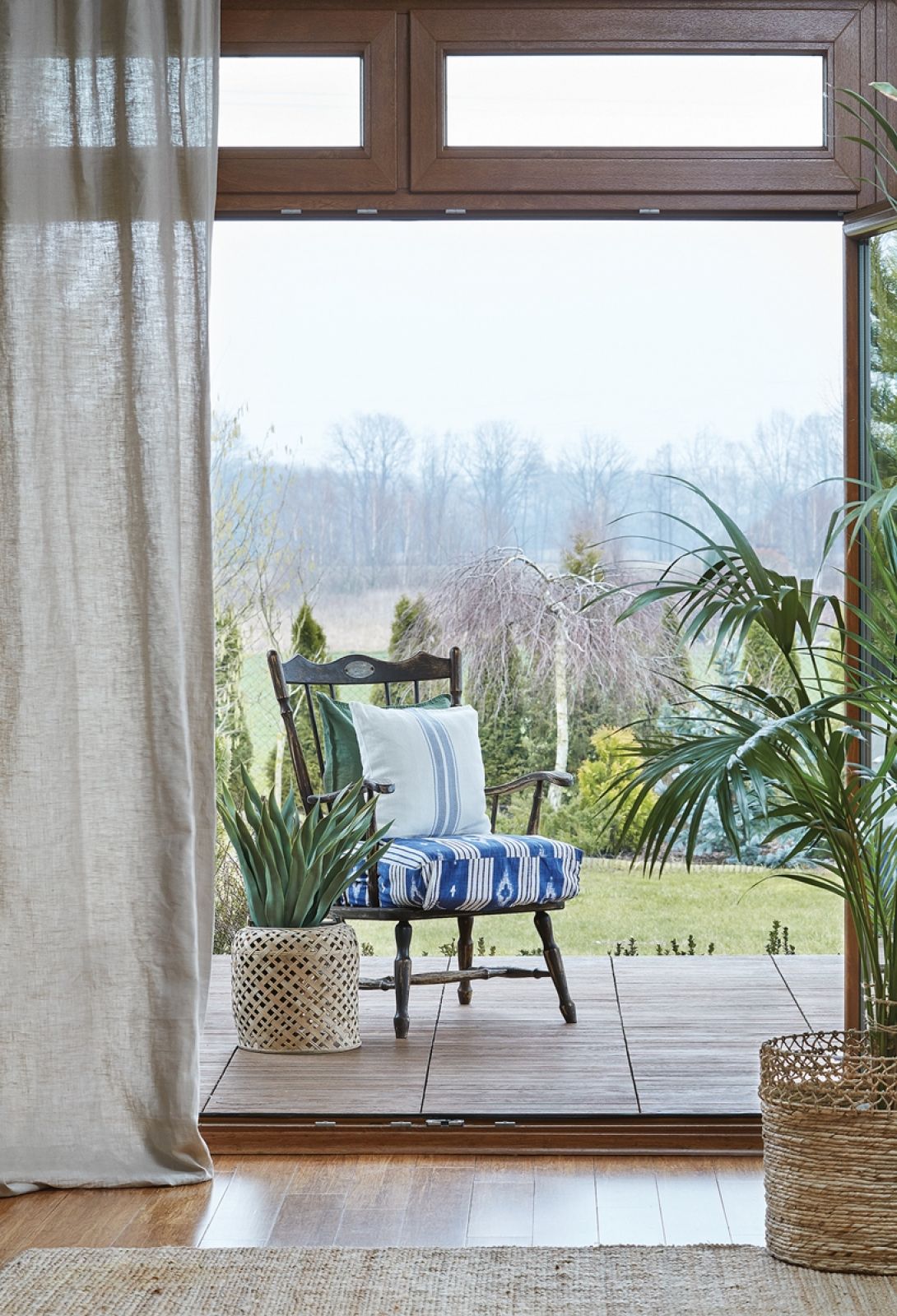 Gdy w końcu kupili działkę i postawili na niej dom, Monika wzięła się do jego urządzania. Miało być sielsko i przytulnie. Krok po kroku realizowała pomysły z teczki. Beżowe i szare ściany wykończyła białymi listwami przypodłogowymi i sztukateriami pod sufitem. Białe są też schody przypominające te z amerykańskich rezydencji. Ze stylu rustykalnego połączonego z hamptons wzięła plecionki. Z koszy porobiła osłonki na donice. Dwa duże, bielone, kupione dawno temu w Auchan, gdy mało kogo wtedy interesowały, pełnią rolę schowków pod regałem.