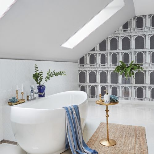 Tapeta Fornasettiego na ścianach w sypialni i łazience