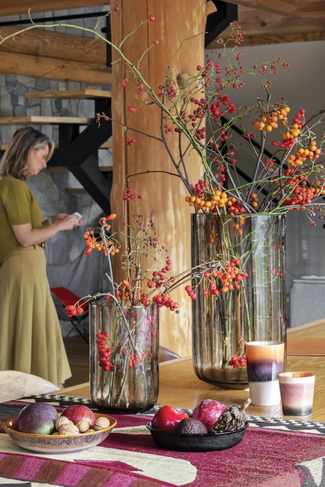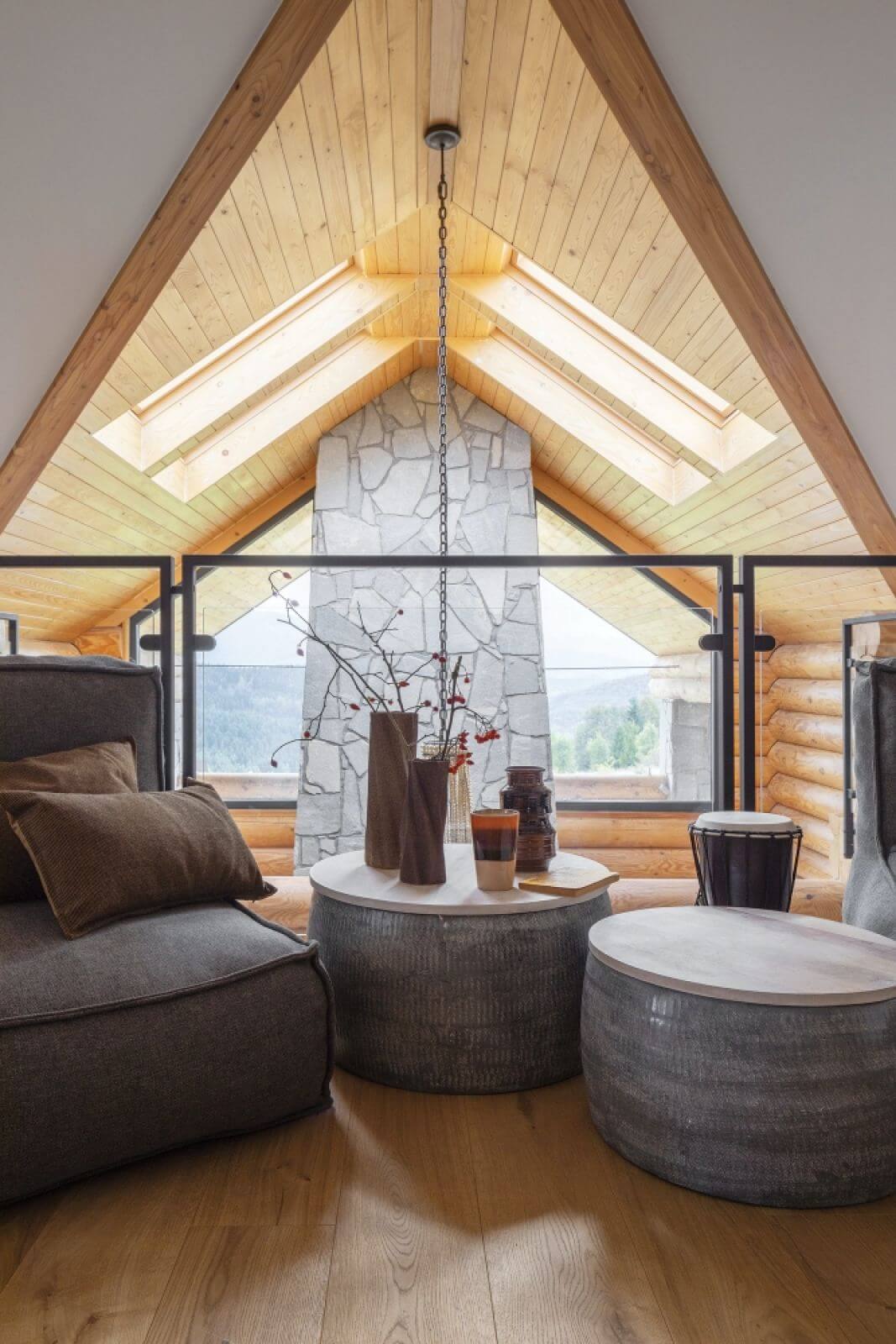 Miejscem, z którego najbardziej można się cieszyć panoramą za oknami, jest salon. Dwukondygnacyjny, przestronny i dobrze doświetlony przez okna w dachu. Punkt centralny stanowi tu przeprojektowany przez Ewę dwustronny kominek – można w nim palić w środku i na zewnątrz – kryty lokalnym kamieniem. We wnętrzach króluje natura, modrzewiowe drewno, wiklina i kamień. Gdzieniegdzie następuje jednak przełamanie – metalowe, przeszklone drzwi do wiatrołapu czy łącząca metal z drewnem klatka schodowa przywodzą na myśl loftowe klimaty.
