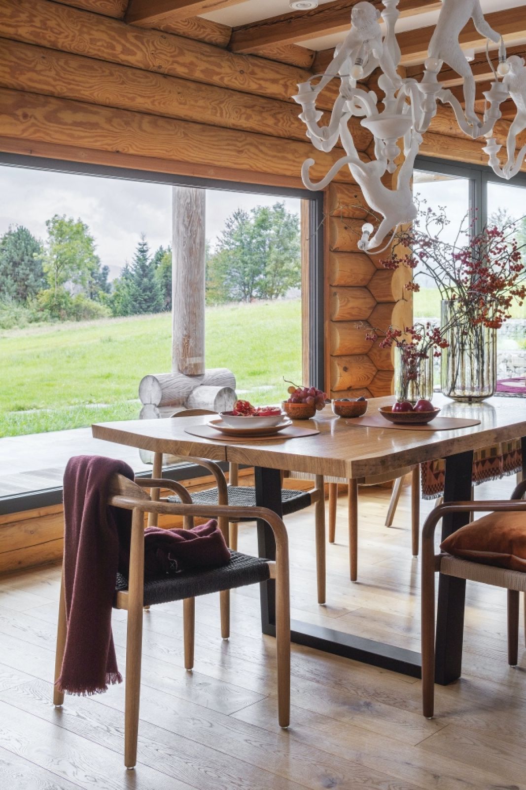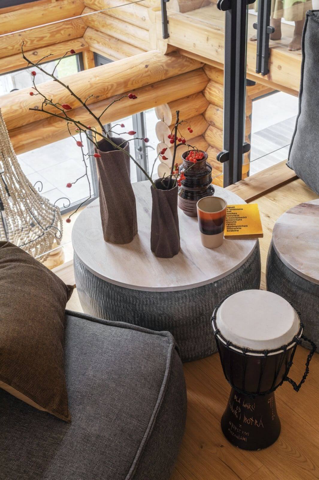 Jaki był pomysł na dom? Ewa używa jednego określenia: „góralska chata w butikowym stylu”. Główną rolę odgrywają tu odpowiednio wyeksponowane drewniane bale i widoki za oknem. Marta żartuje, że w sumie nie potrzeba żadnych ozdób wieszać na ścianach, wystarczy patrzeć na Beskidy i Babią Górę.