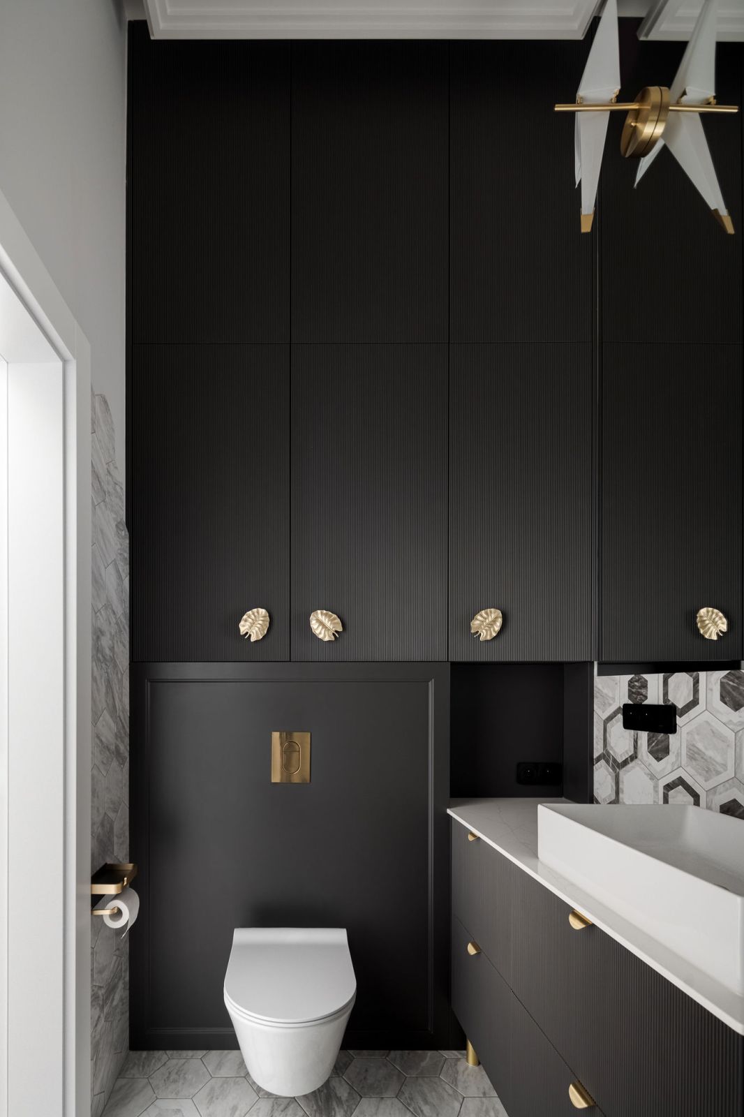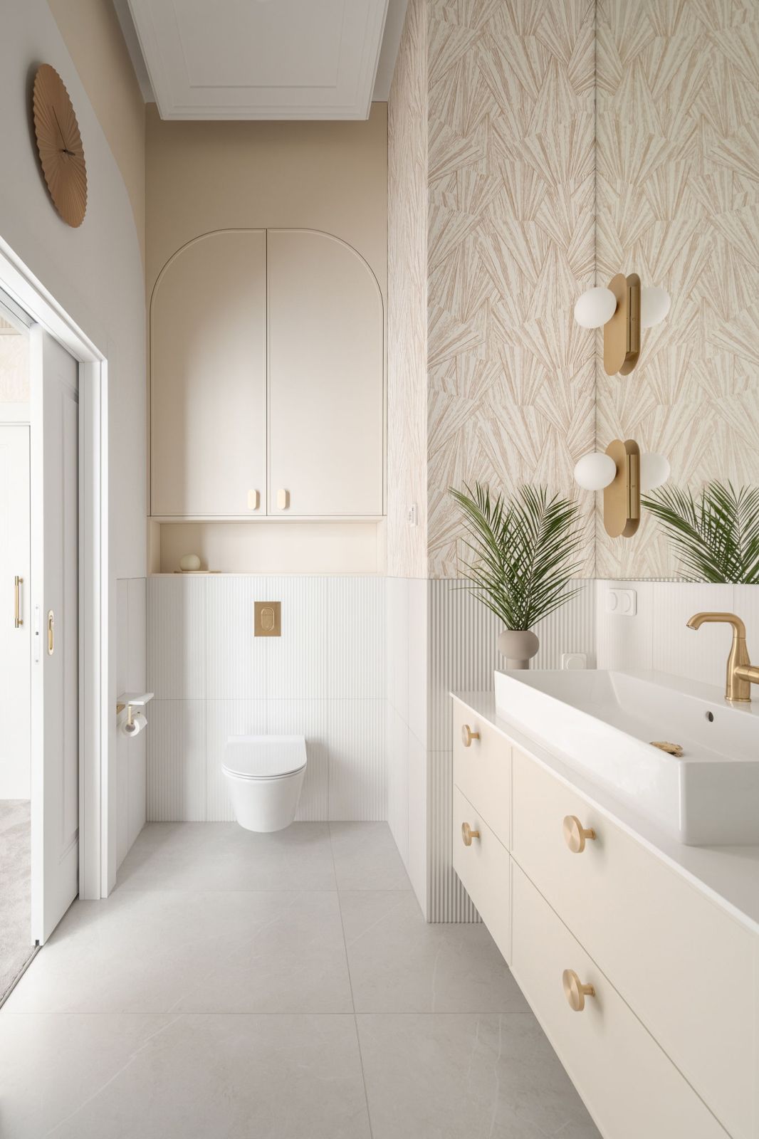 Na szafce Marika osadziła prostą umywalkę – duże lustro nad nią optycznie powiększa przestrzeń. Kolorystyczne niuanse ożywiają pomieszczenie – projektantka sprytnie je zróżnicowała, żeby nie było nudno. Na ścianach położyła strukturalne płytki w chłodniejszych odcieniach, a wyżej nieco ciemniejszą tapetę w ciekawy florystyczny wzór. Cieplejszy odcień zyskały również meblowe zabudowy. Akcenty rozświetlające i dodające eleganckiego sznytu to kinkieciki mocowane do lustra, złote baterie i uchwyty.