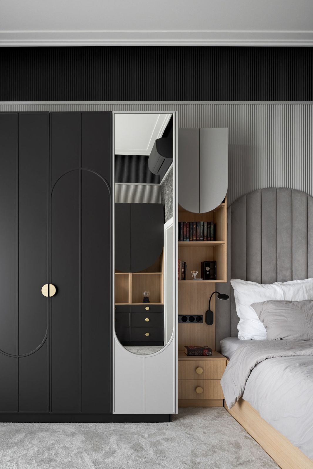 Intymne miejsce do odpoczynku pełne spokoju i przytulności. Ten zamysł udało się w stu procentach zrealizować. Pokój do relaksu przypomina elegancką bombonierkę wyścieloną miękkim suknem. Za komfortowym łóżkiem powstała ciekawa ściana, która łączy ryflowaną okładzinę z drewna z tapicerowanymi panelami. Miękkie pasma materiału rozdzielają duże lustra, które optycznie powiększają pomieszczenie.