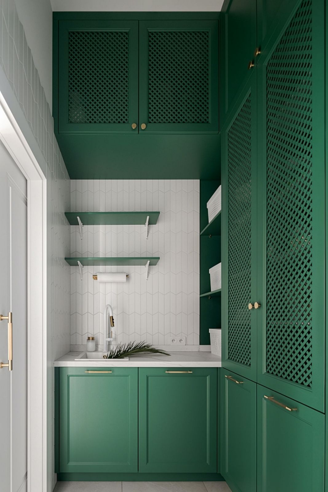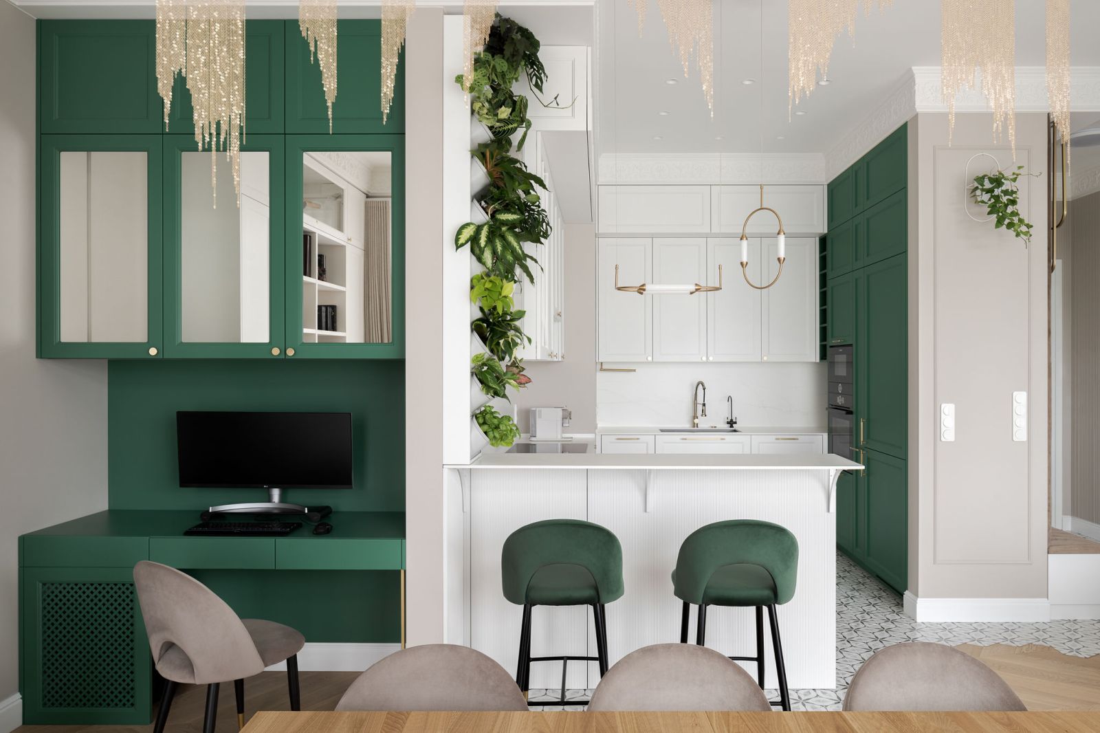 Biała kuchnia z akcentem w kolorze butelkowej zieleni