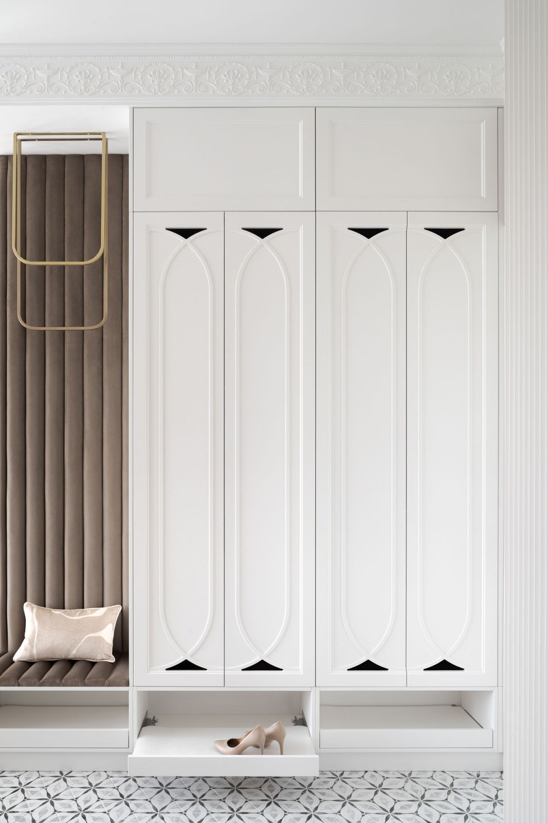 Wędrówkę po mieszkaniu kończymy na pięknie zaprojektowanym przedpokoju. Tu wzrok przyciąga minigarderoba w postaci dużej szafy na okrycia wierzchnie. Ciekawe fronty zdobią frezy nawiązujące do secesyjnych dekoracji – idealnie łączą się z ozdobnymi listwami sztukateryjnymi przy suficie.