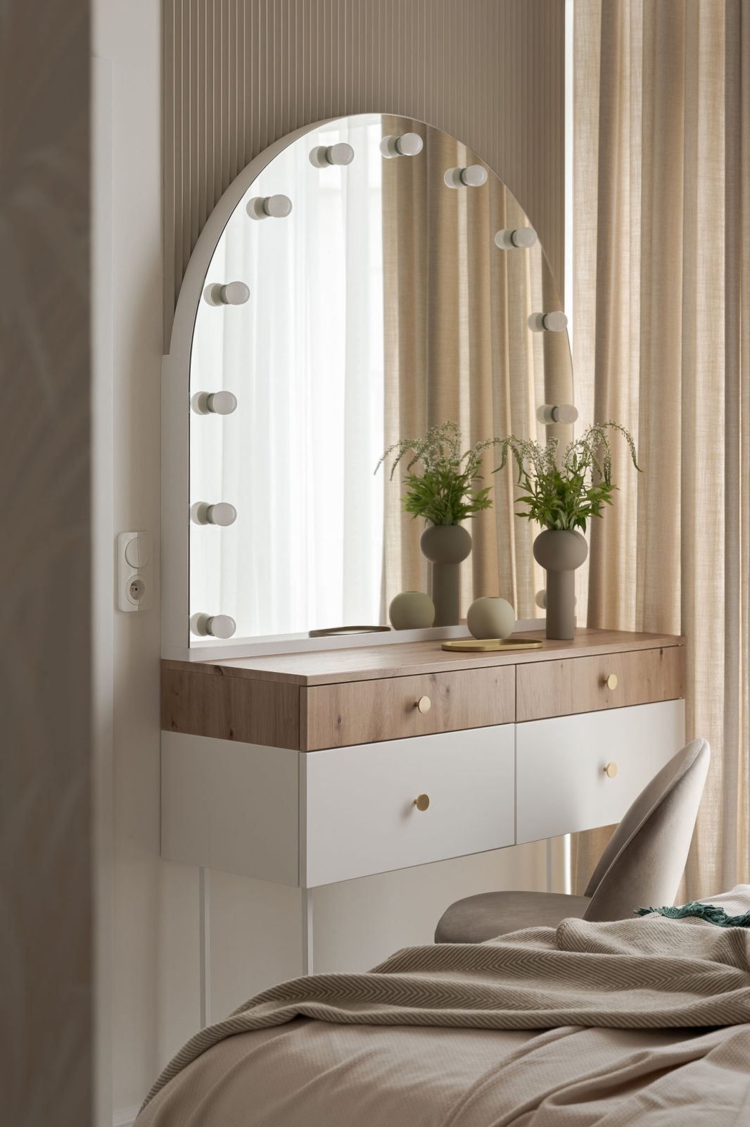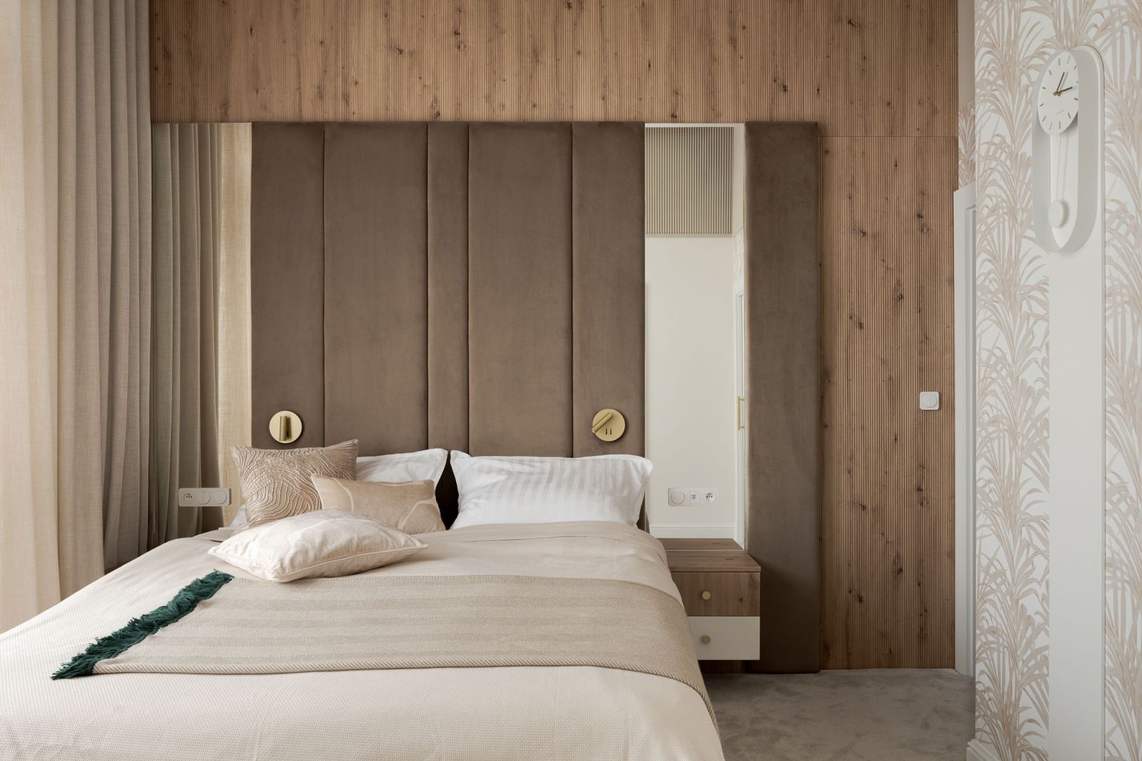 Kolorystyka wnętrza opiera się na subtelnych tonacjach ciepłych szarości, beżów i kremów, które idealnie współgrają̨ z akcentami złota nadając wnętrzom elegancji i spokoju. Kunsztowne detale, takie jak oryginalne lampy i uchwyty, dodają̨ przestrzeni charakteru i wyrafinowania. Taka też miała być sypialnia właścicieli.