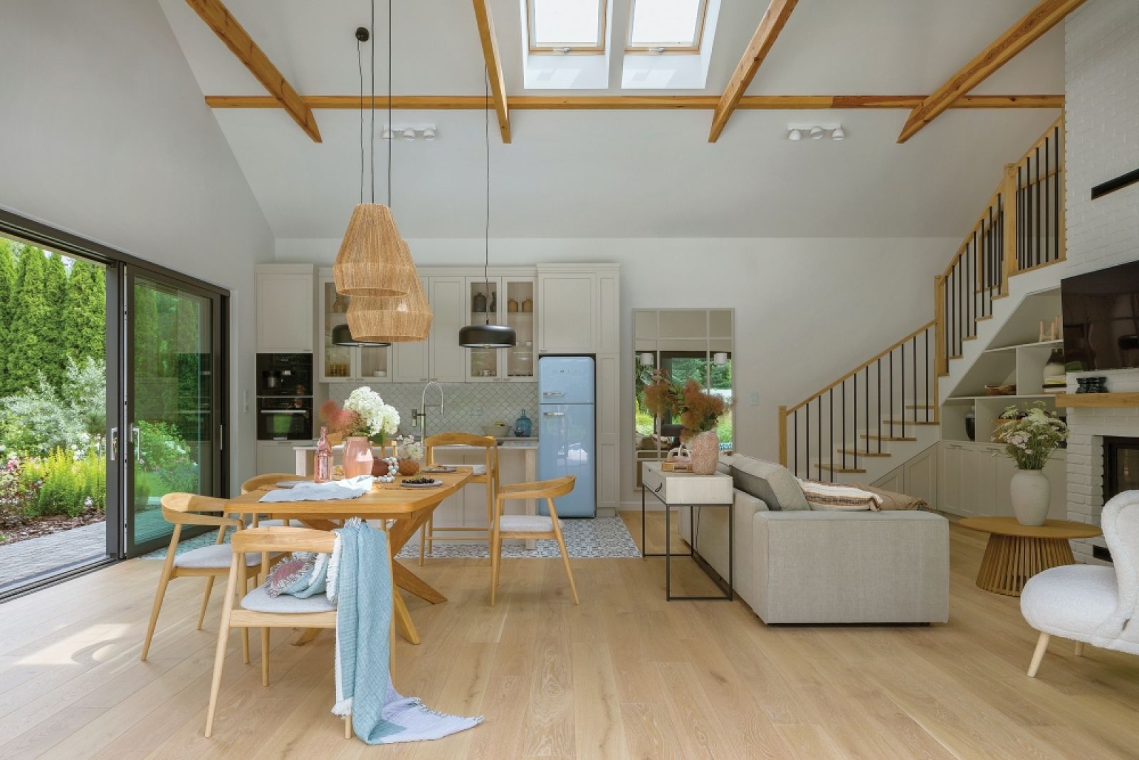 Dom nie jest duży (ma 70 metrów, udało się w nim zmieścić także saunę), ale łatwo można go powiększyć dzięki wielkim oknom, które po rozsunięciu łączą wnętrze z tarasem i basenem otoczonym trawami. Latem kwitną tu róże, a hortensje uginają się pod bujnymi kwiatostanami. Edyta kocha kwiaty, ogród to jej oczko w głowie. Tworzy z roślin kompozycje, świeżą zielenią dekoruje dom.