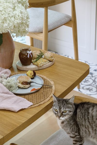 Ma jeszcze jedną pasję – piękne przedmioty. – Niektóre kobiety kolekcjonują ciuchy, a ja dekoracyjne bibeloty – śmieje się. Lubi zmiany, a najbardziej cieszą ją te niewielkie. Czasem coś poprzestawia, doda poduszkę, narzuci pled, inaczej ustawi drobiazgi na półkach… – Uwielbiamy ten gościnny dom – przyznaje. – Spędziliśmy w nim całe lato i nie zapowiada się, żeby w przyszłym roku miało być inaczej.