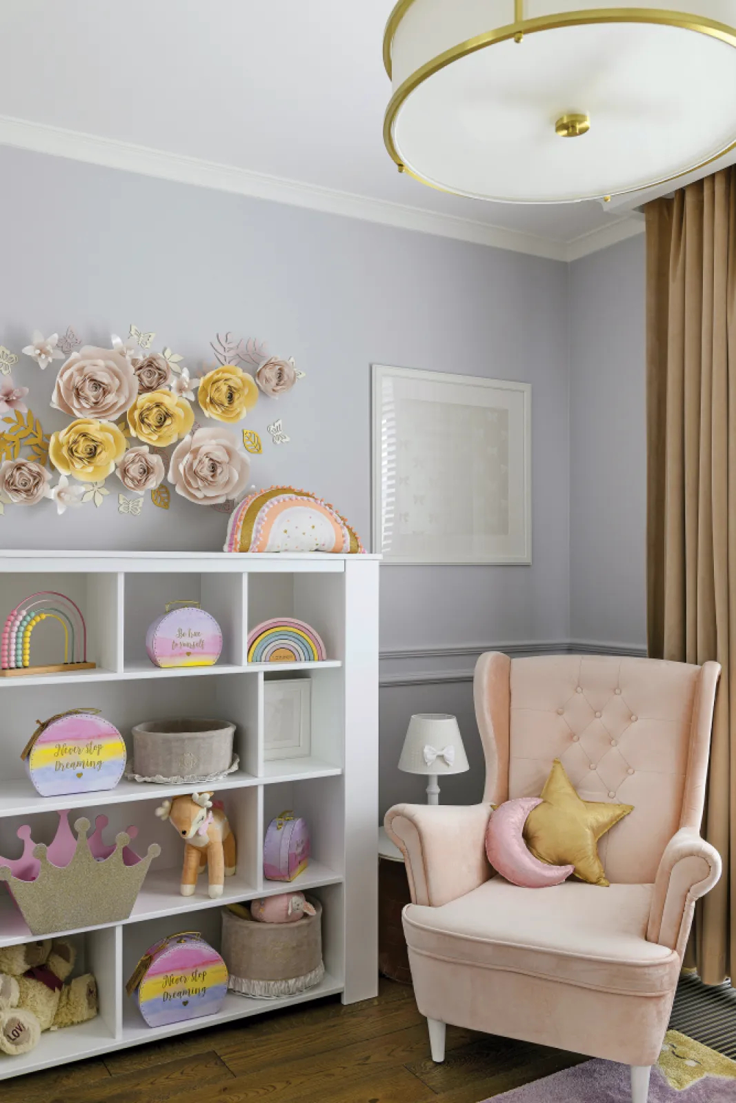 Innym oryginalnym elementem w tym domu są szklane drzwi w złotym obramieniu. Ściany projektantka udekorowała starannie dobranymi abstrakcyjnymi obrazami, papierowymi kwiatami, rodzinnymi zdjęciami i lustrami. Beżowa sofa w salonie wygląda lśniąco, tak samo wykonany na zamówienie morelowy fotel w pokoiku Madzi. Nie ma na nich ani śladu po czekoladowych paluszkach…