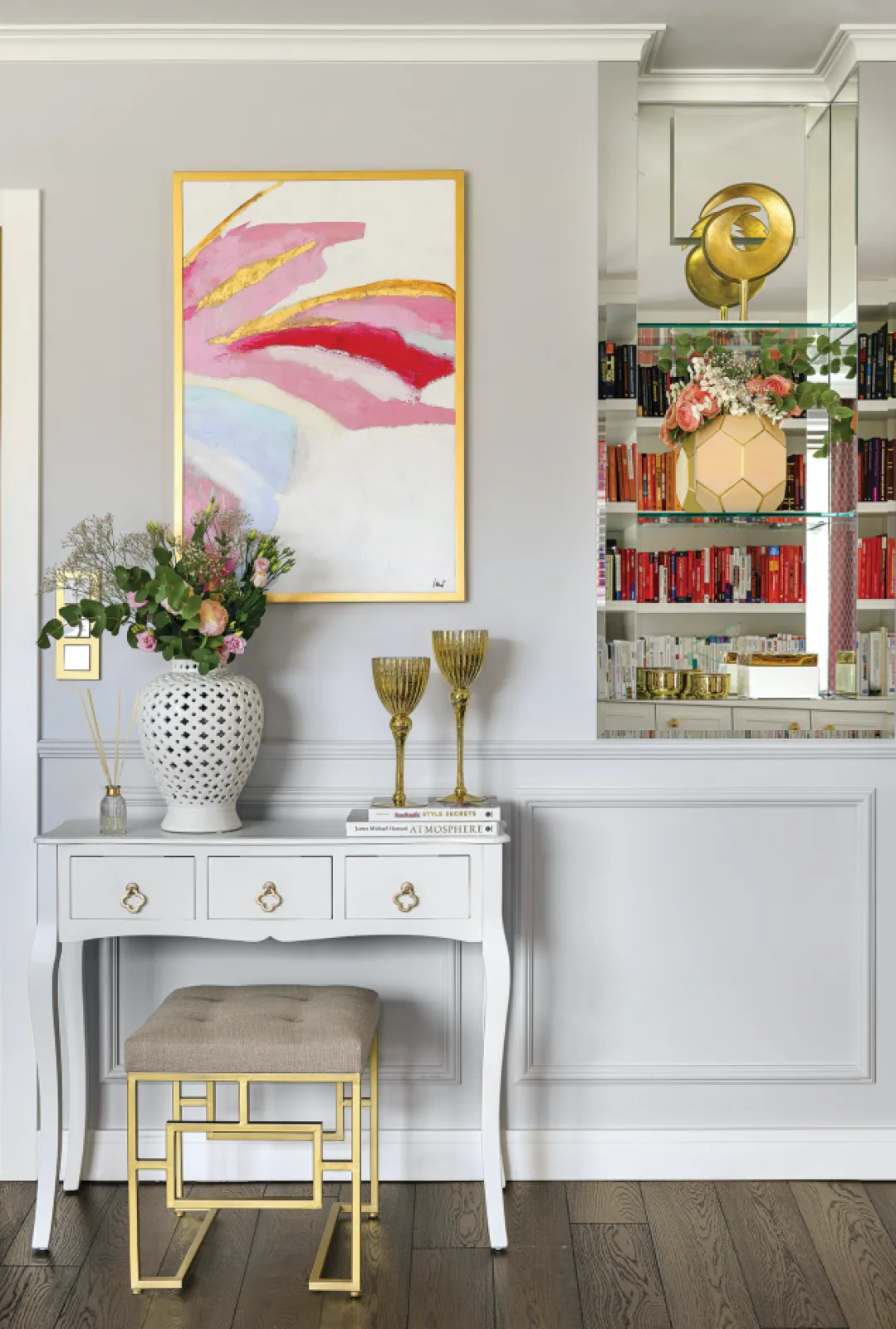 Joanna najwięcej inspiracji przy urządzaniu mieszkania czerpała ze stylów amerykańskich. Dom w rezultacie nawiązuje do stylów nowojorskiego i glamour. Ważne było dla niej, aby kolory w mieszkaniu były jasne – białoszare, jak malarskie zagruntowane płótna. – Tak, aby można było komponować na nich różne wzory, kolory, motywy w zależności od pór roku, etapów życia i nastrojów – tłumaczy właścicielka. – Nasz dom nie ma jednej stałej aranżacji. Ewoluuje nieustannie wraz z porami roku i naszymi potrzebami. Owszem, kluczowa paleta kolorów w mieszkaniu została oparta na pudrowym różu i złocie, lecz sezonowo wprowadzam tu różne inne barwy. Wiosną i latem jest tutaj więcej żółci, zieleni, a nawet oranżu i błękitu, jesienią purpury i bordo. Lubię kolory, ponieważ wyzwalają niezwykłą energię i dają siłę do działania. Najbardziej wierna jestem jednak barwie złotej, która jest ciepła i szlachetna. Złote dodatki pojawiają się w naszym domu niczym biżuteria.