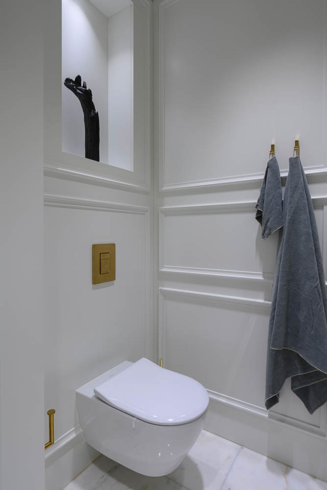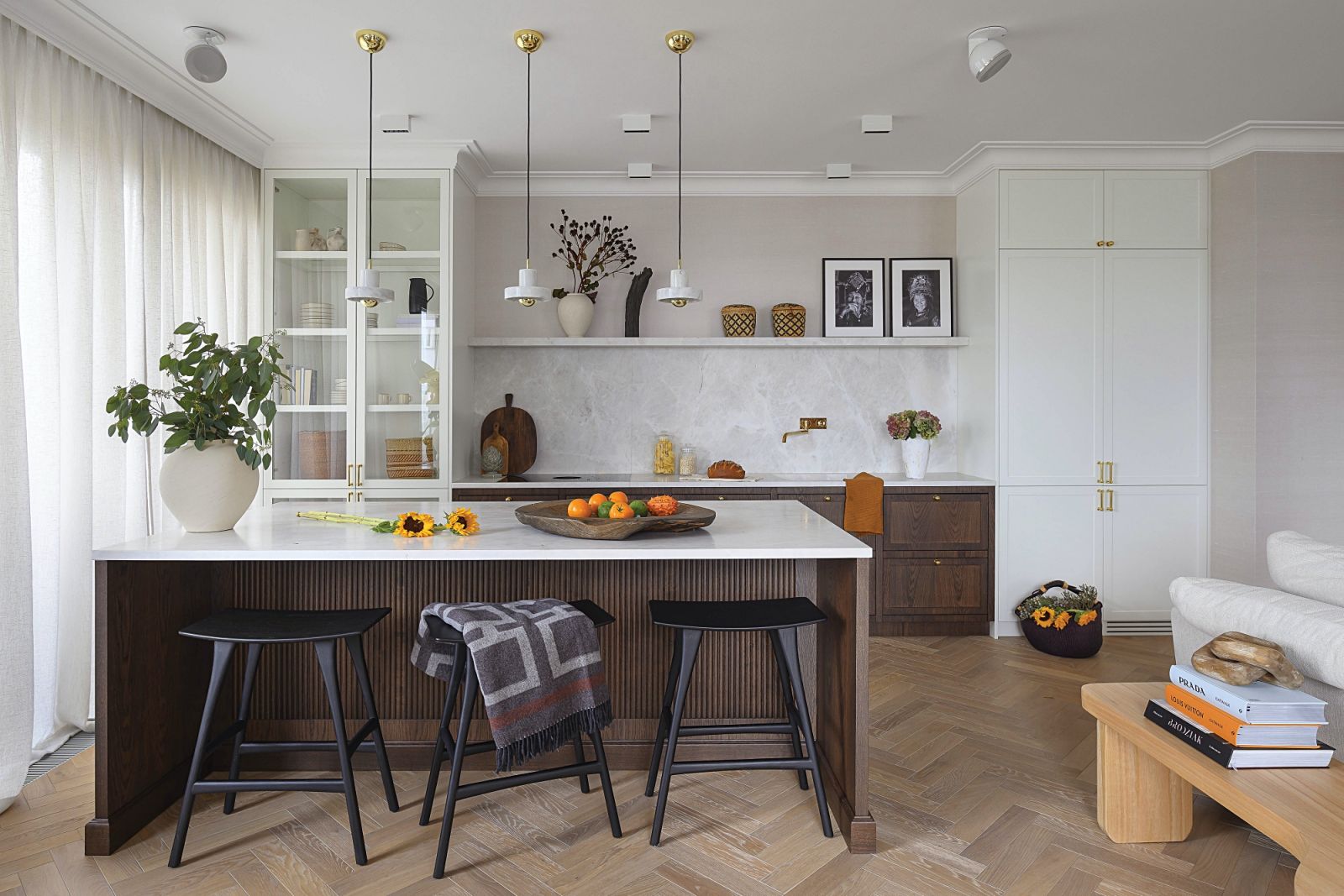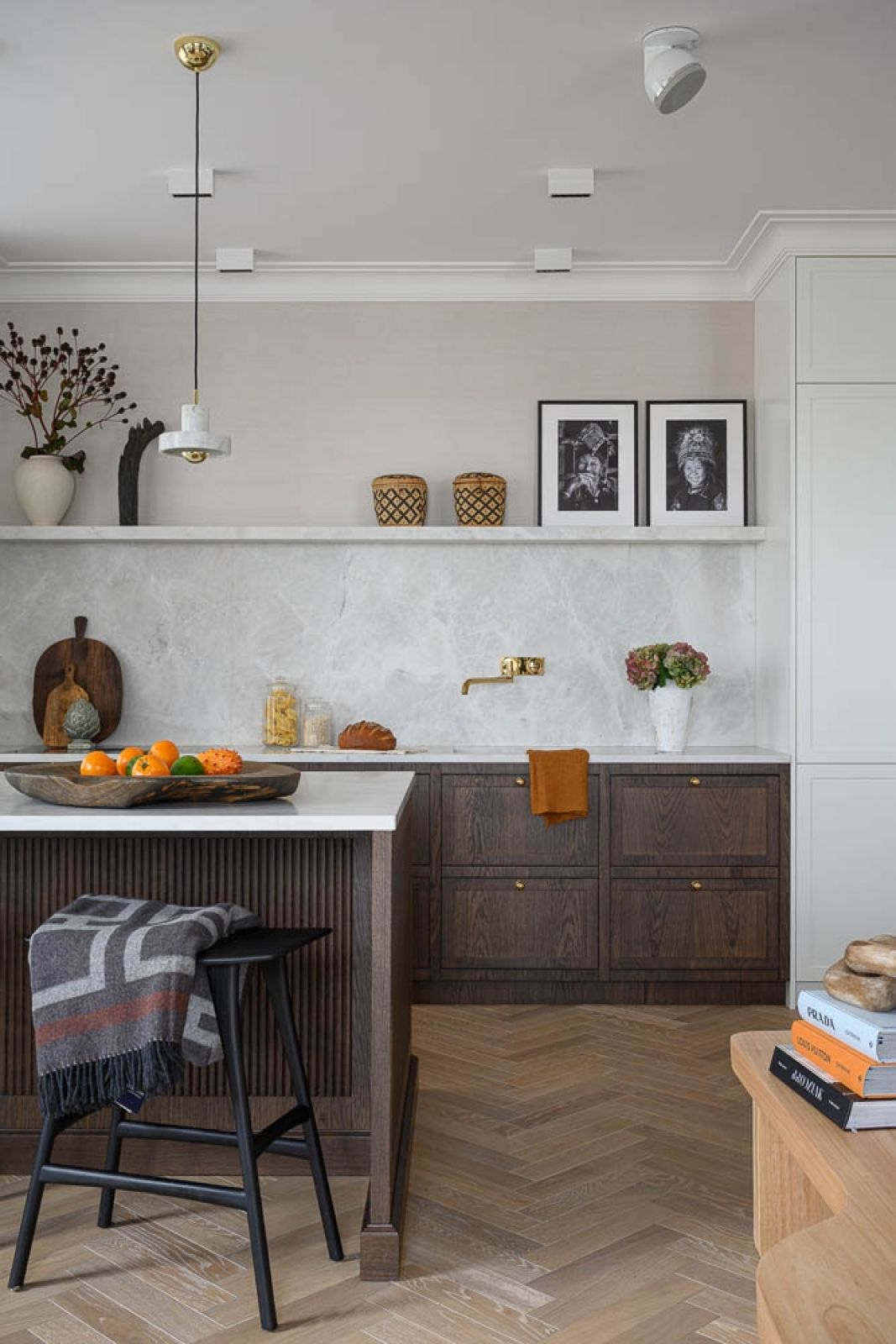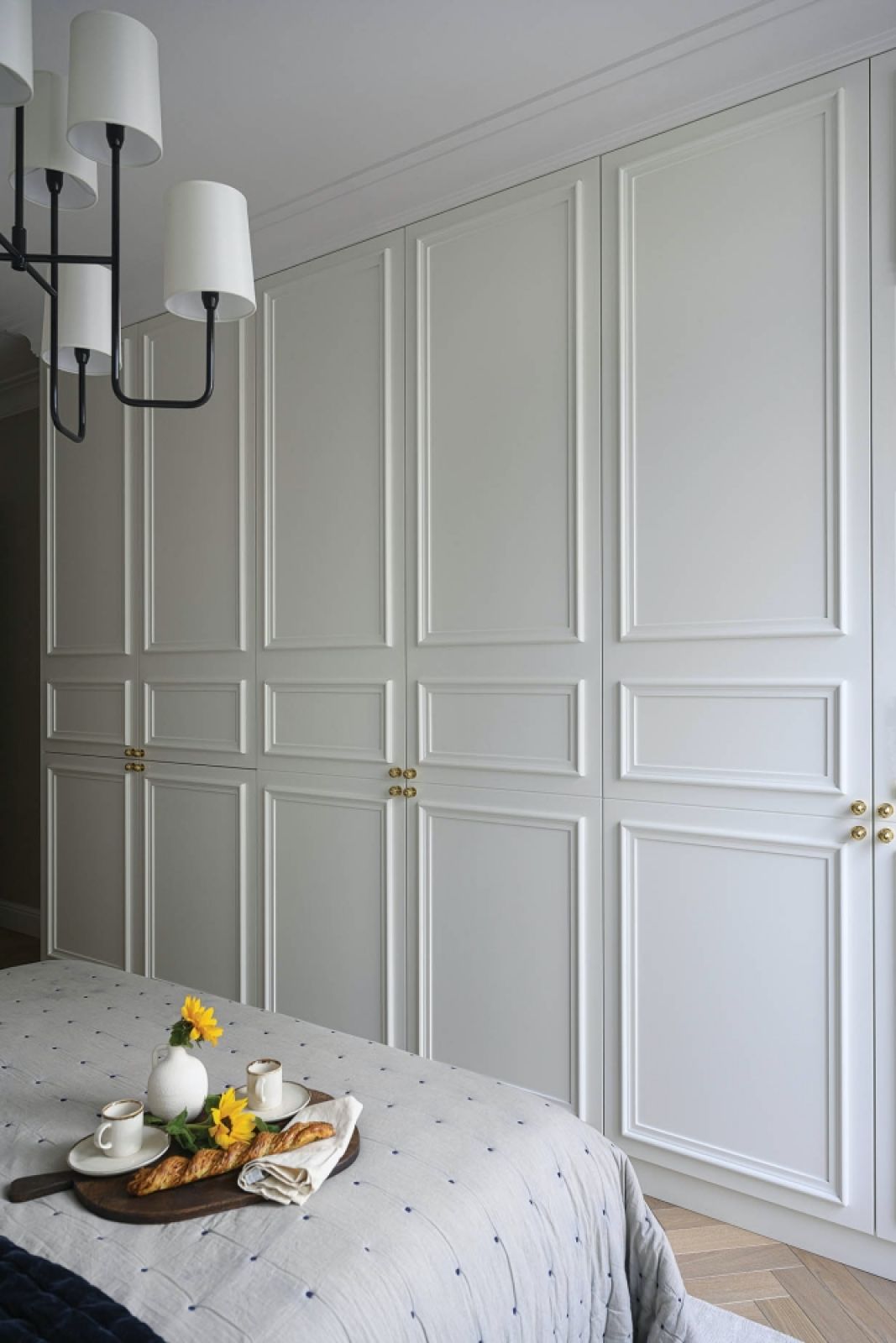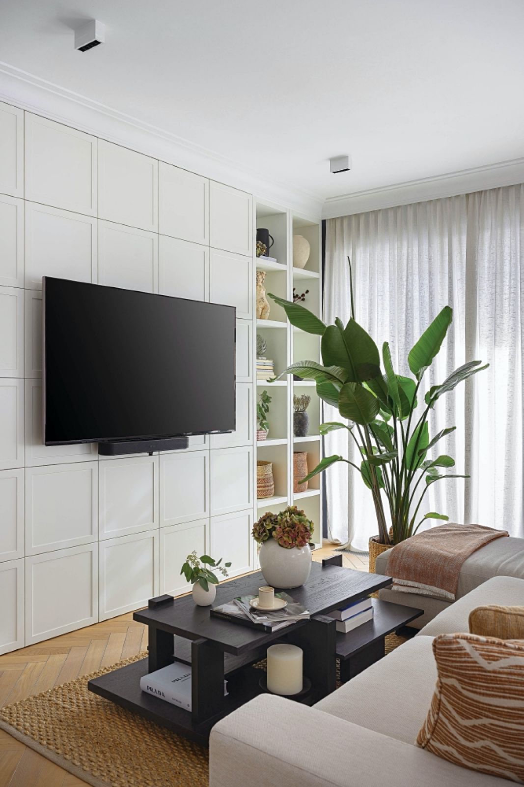 Ewie zależało również na przestrzeni do przechowywania. Stąd zabudowa w sypialni, łazience i salonie, którą projektantka sprytnie wymyśliła. Cała ściana za telewizorem to ukryte za sztukaterią szafki. Z kolei kuchnia została wizualnie „odciążona”: nie ma tu wiszącej zabudowy, są za to dwie wysokie witryny.