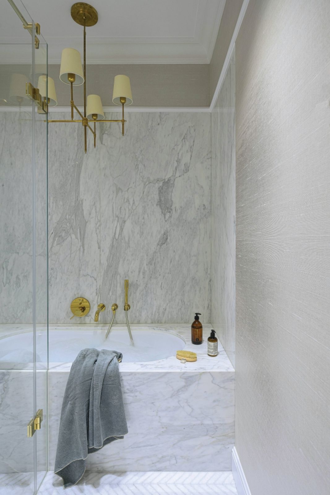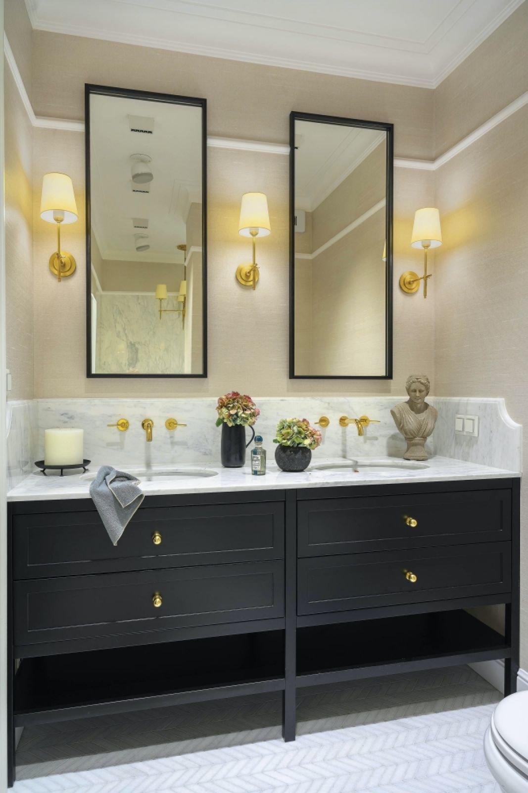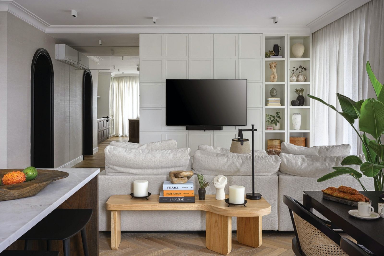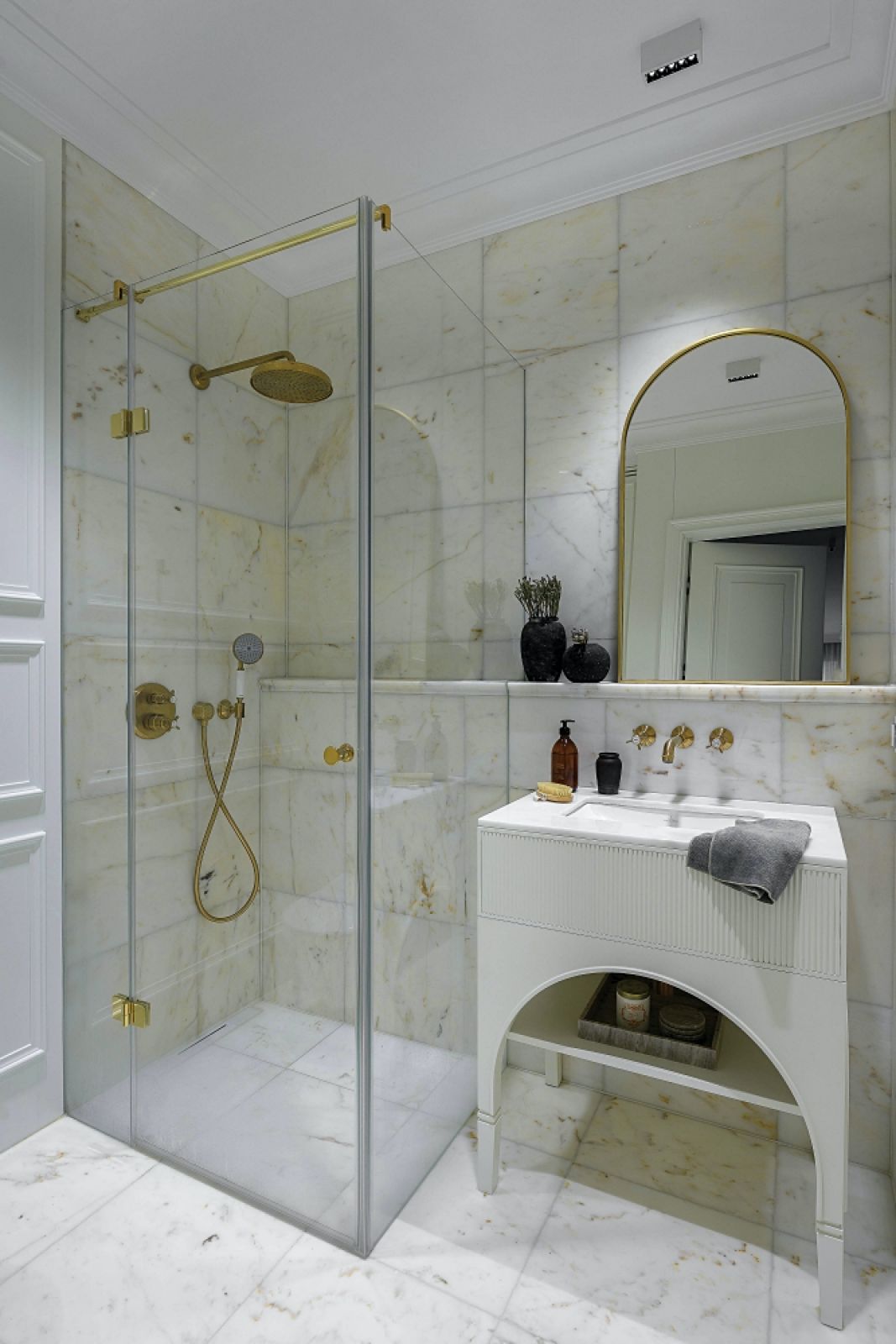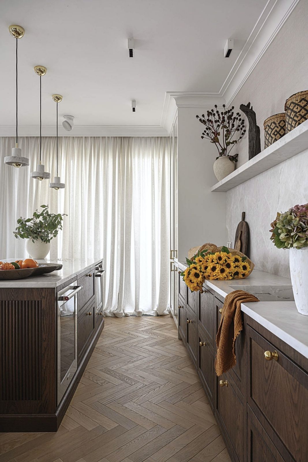 Ewie zależało również na przestrzeni do przechowywania. Stąd zabudowa w sypialni, łazience i salonie, którą projektantka sprytnie wymyśliła. Cała ściana za telewizorem to ukryte za sztukaterią szafki. Z kolei kuchnia została wizualnie „odciążona”: nie ma tu wiszącej zabudowy, są za to dwie wysokie witryny.