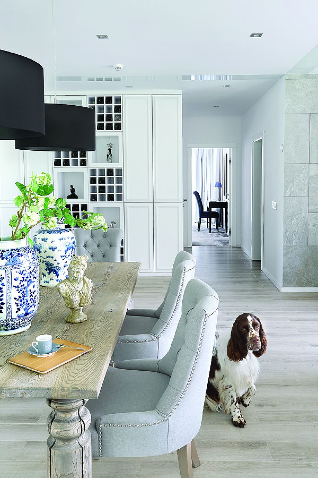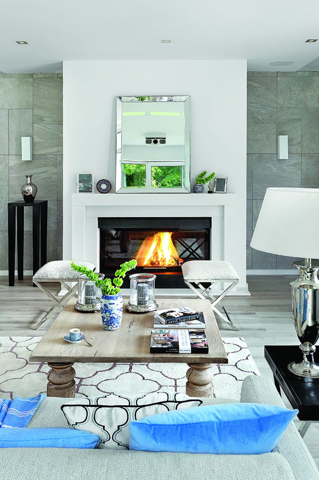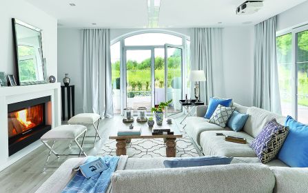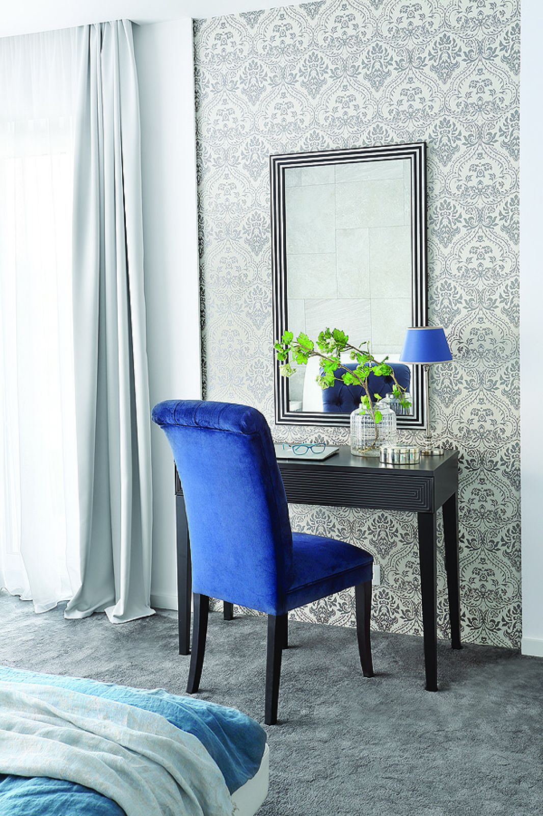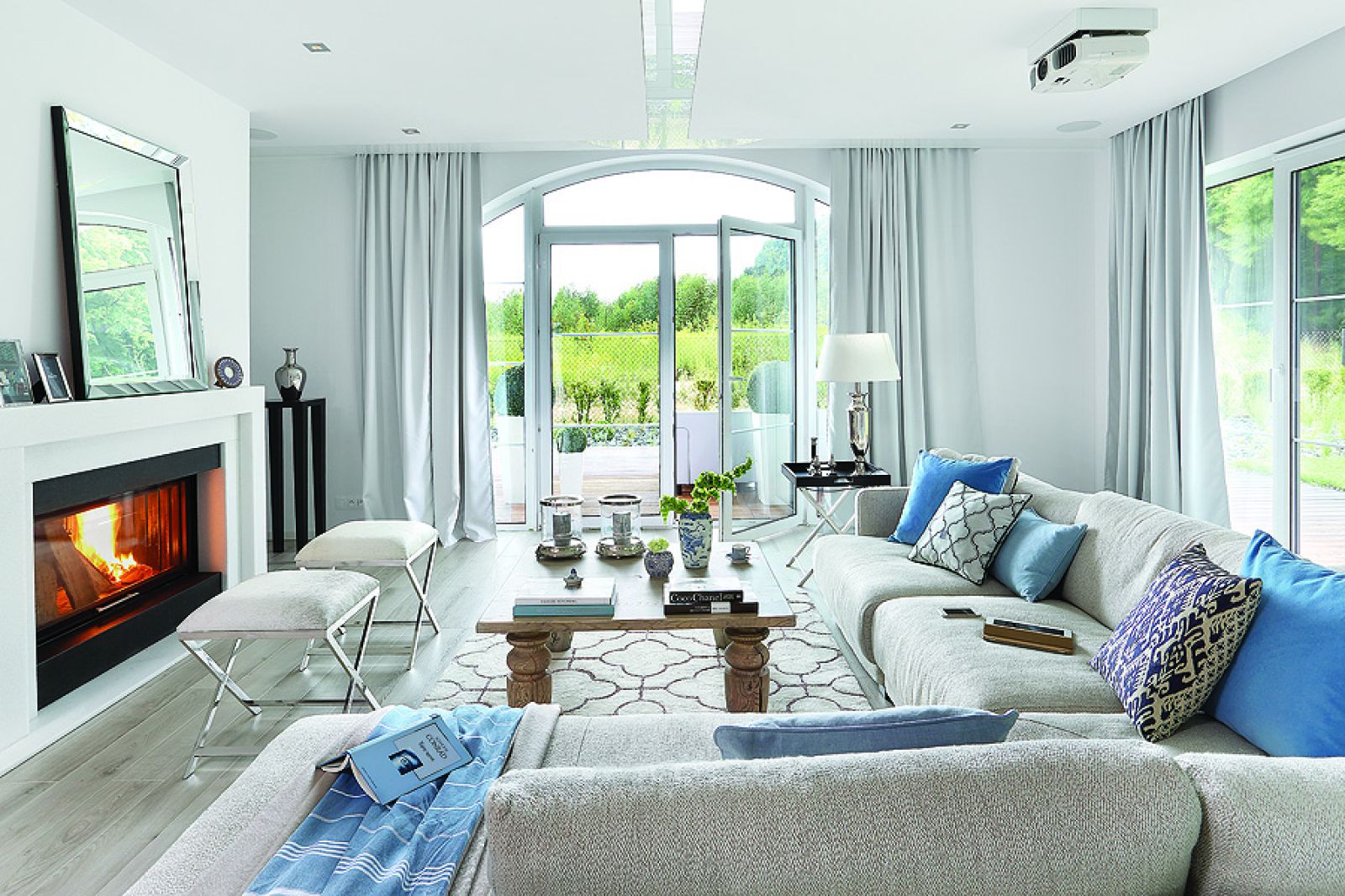Ciąg dalszy podpowiedziała stylistka Katarzyna Sawicka. To jej pomysłem jest dywan z marokańskim wzorem, niebieskie poduszki oraz dodatki w klasycznym stylu: lustro nad kominkiem, pufy na krzyżakowych nogach, krzesła obite szaro-niebieską tkaniną, stoliki czy połyskująca chromem lampa.