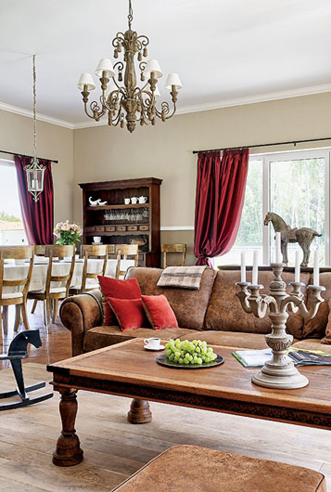 Paulina i Tomek umówili się, że skoro ich pierwszy dom (prowansalski w klimacie) jest oczkiem w głowie pani domu, to ten zostanie wizytówką gospodarza. Tomek wspaniałomyślnie nie wtrącał się w urządzanie, ale co jakiś czas przypominał: „Żadnych kwiatów! Bardziej brązowo!”. Więc jest. Z bezpiecznymi, ale ożywiającymi ciemnoczerwonymi i butelkowozielonymi akcentami zasłon i poduszek.