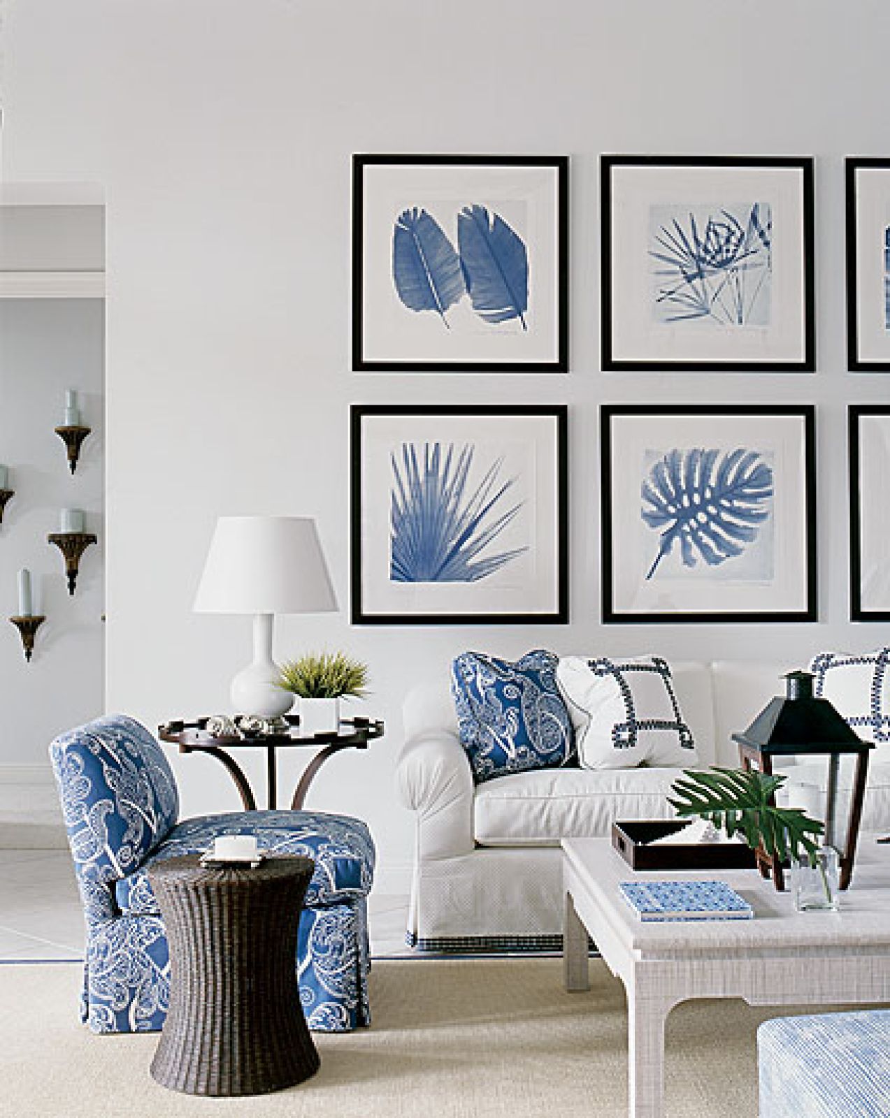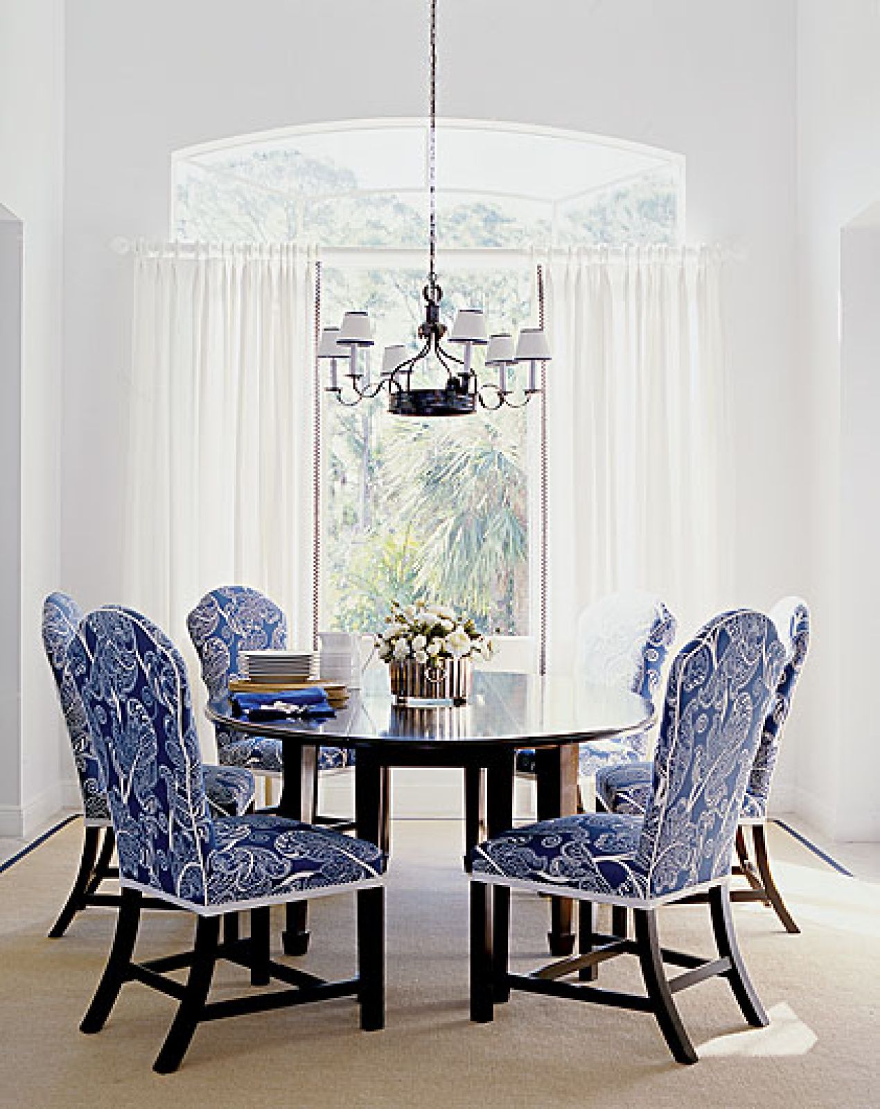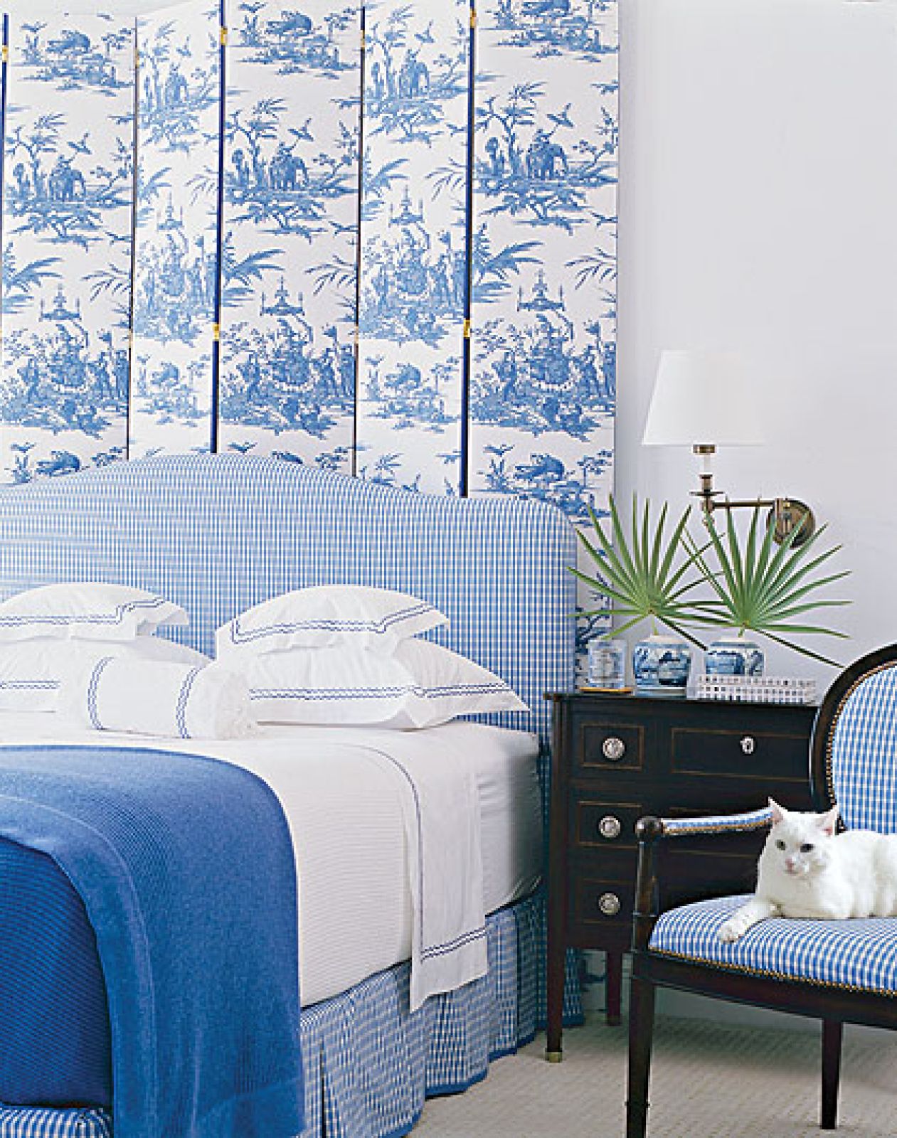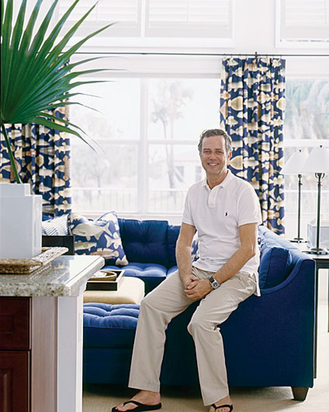 Od mebli obitych niebieskimi wzorzystymi tkaninami (żeby nie było monotonnie, do marynistycznych ornamentów dodał kratkę) trudno oderwać wzrok. Bardzo starannie podobierał odcienie – od morskiego w pokoju gościnnym, przez błękit francuski w sypialni, po indygo w holu.