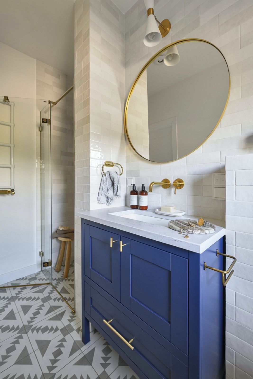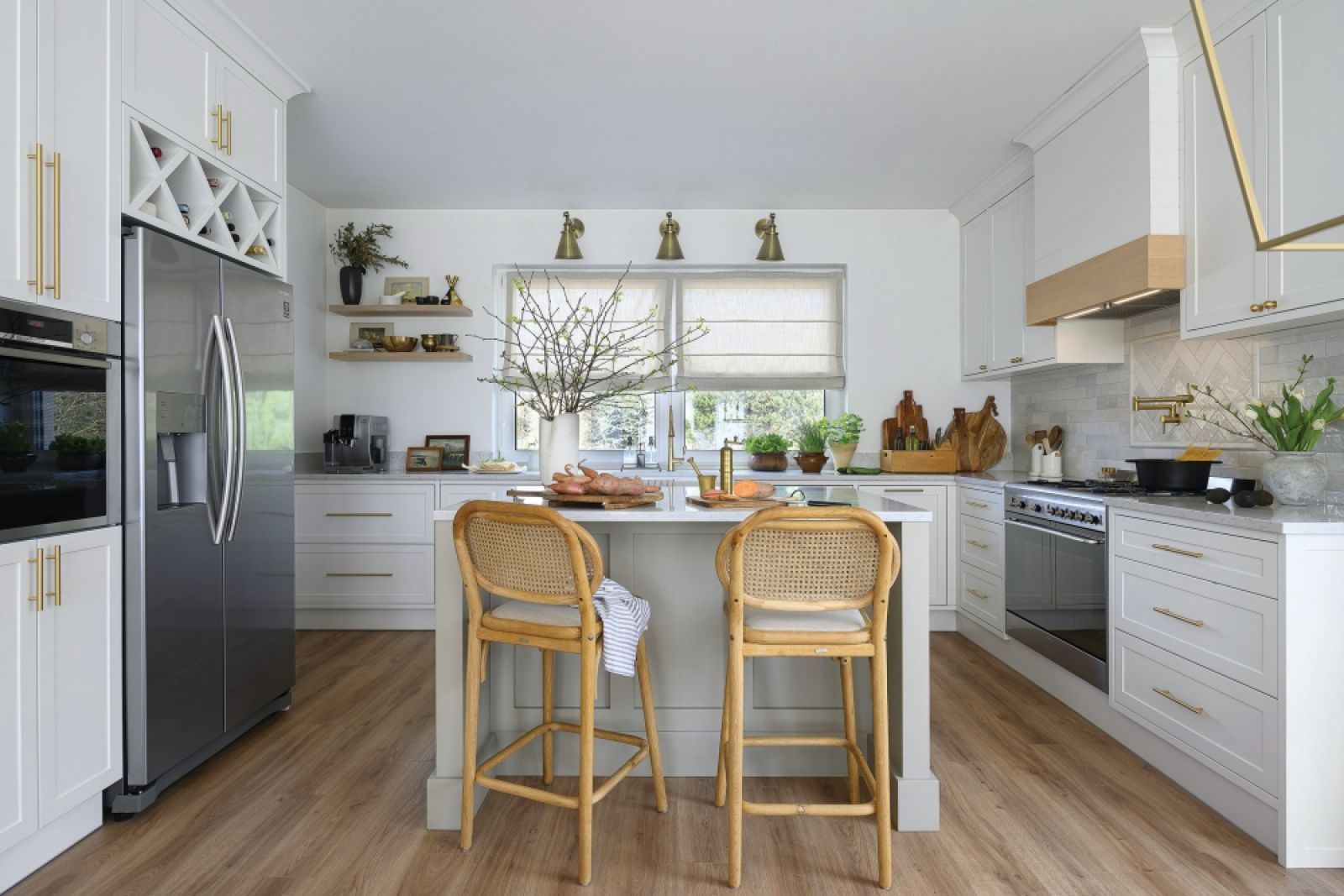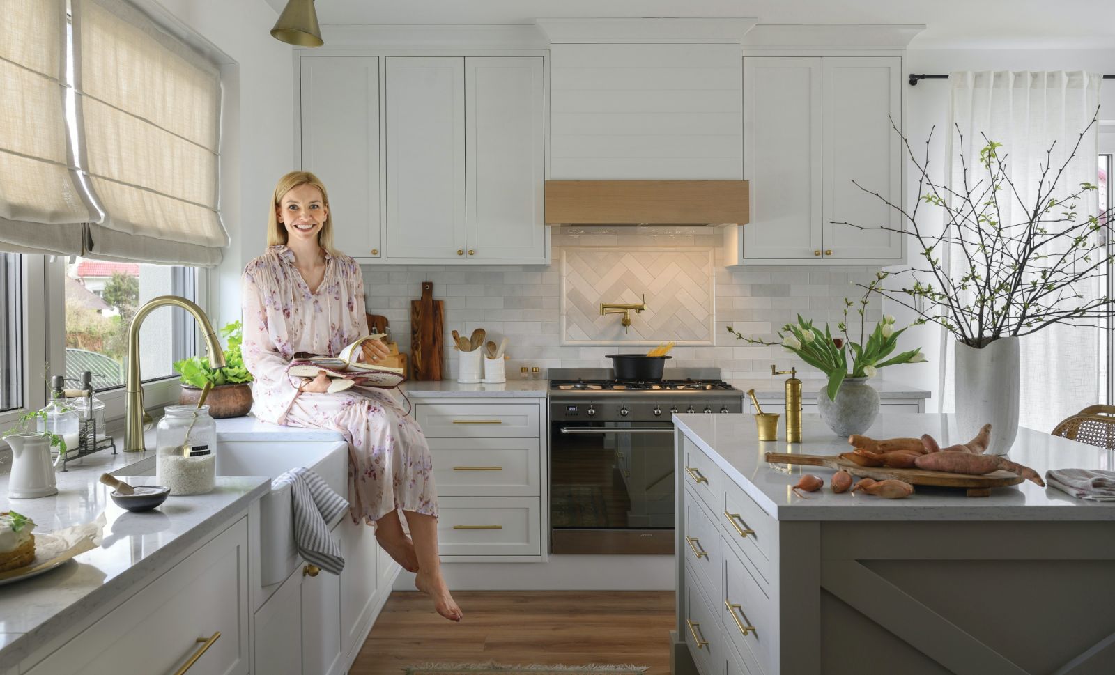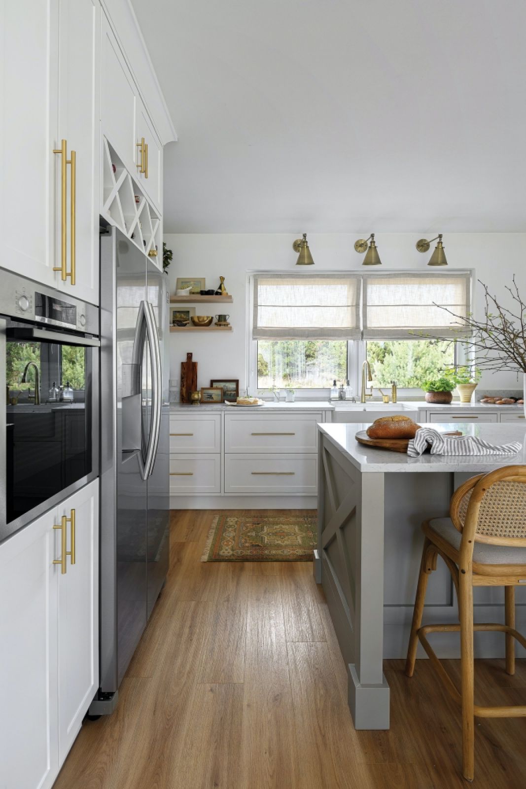 Postawiła raczej na autorską wariację na temat stylu modern farmhouse. Dlatego pojawiły się dodatki z metalu: mosiądzu i chromu. Złote elementy są jednak szczotkowane, aby uzyskać elegancki, ale mniej dosłowny efekt. Połączenie drewna i metalu nadaje wnętrzom lekkość, a naturalne tkaniny – przytulność. Nie ma tu rustykalnych krzeseł czy baterii w stylu retro, ale delikatnym ukłonem w stronę farmhouse jest boazeria board and batten.