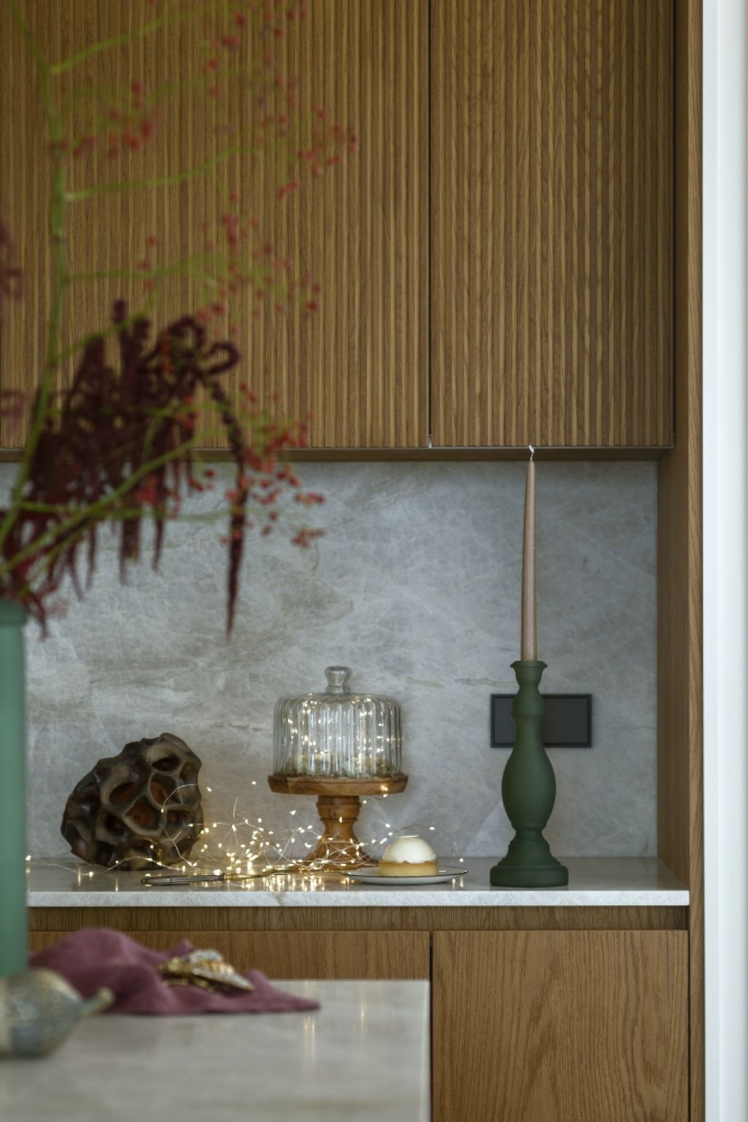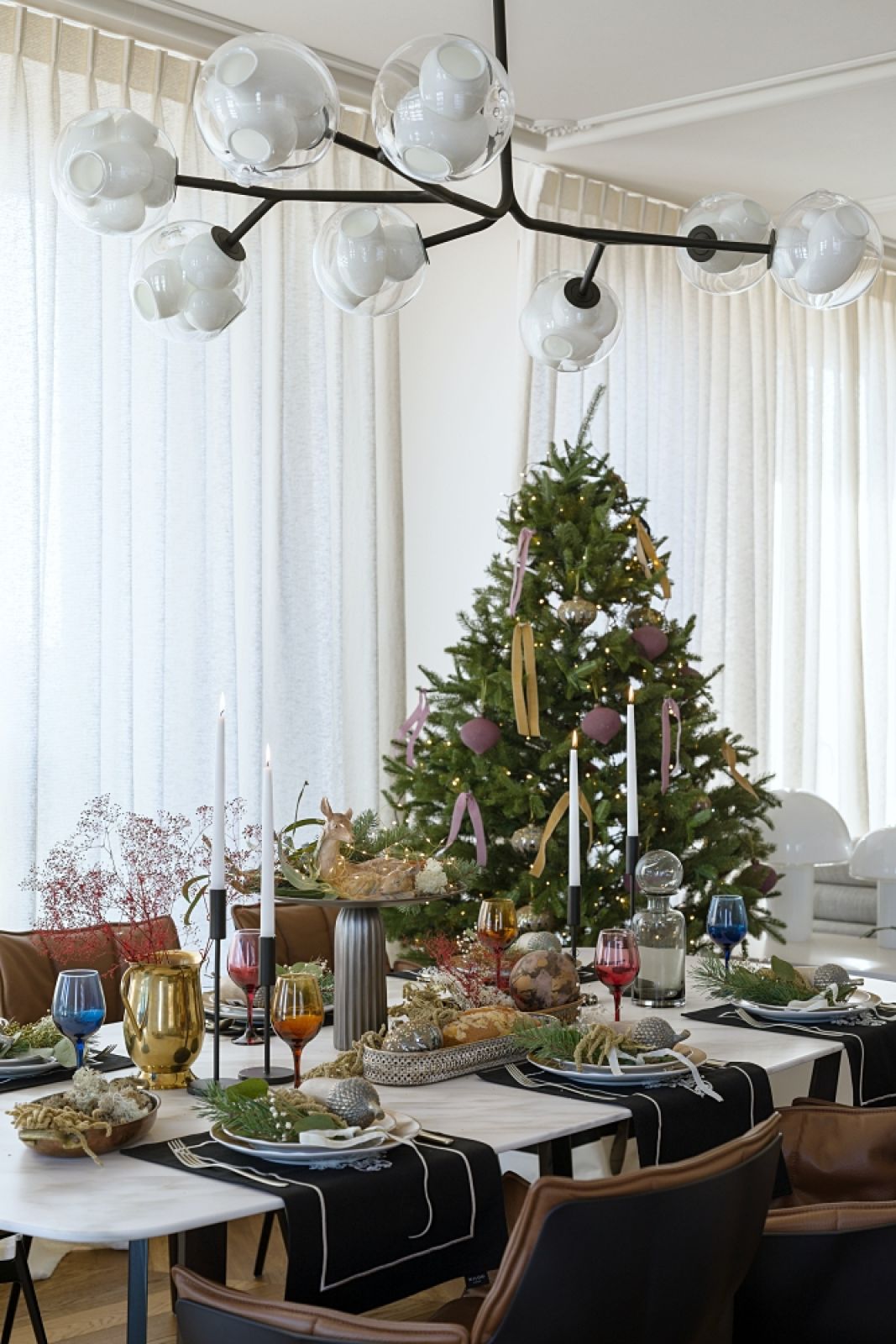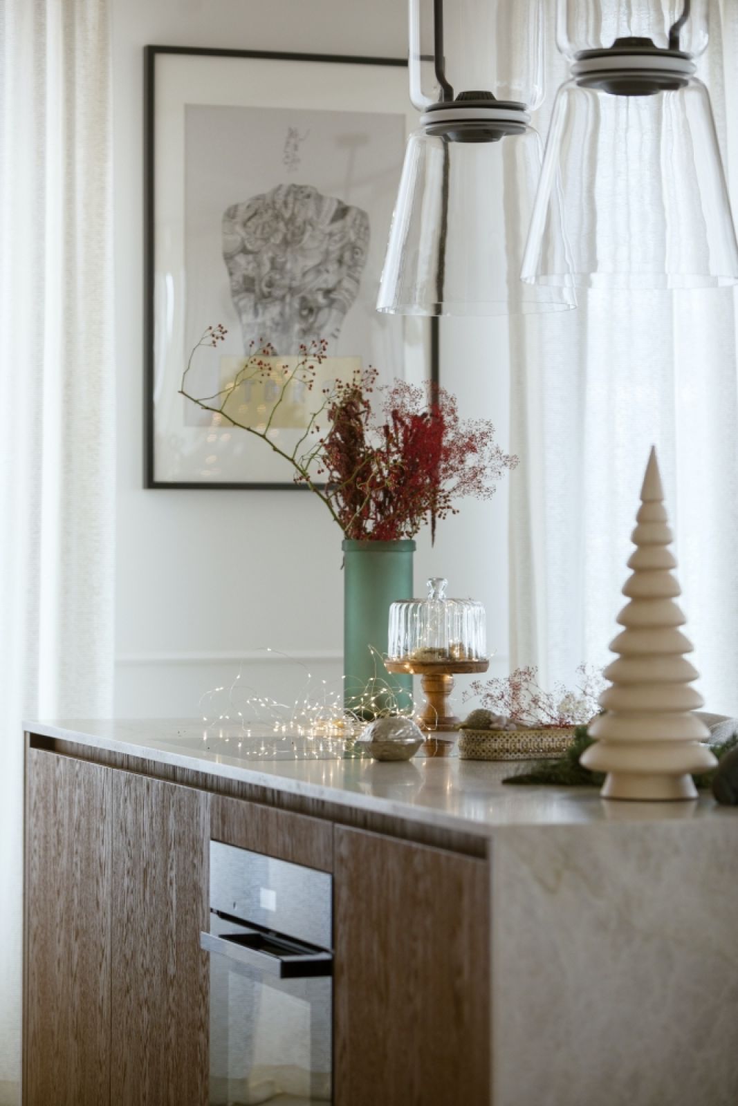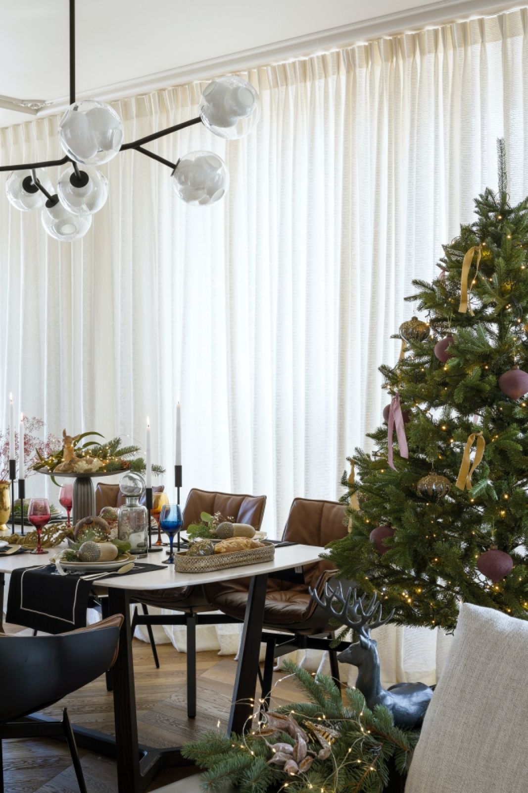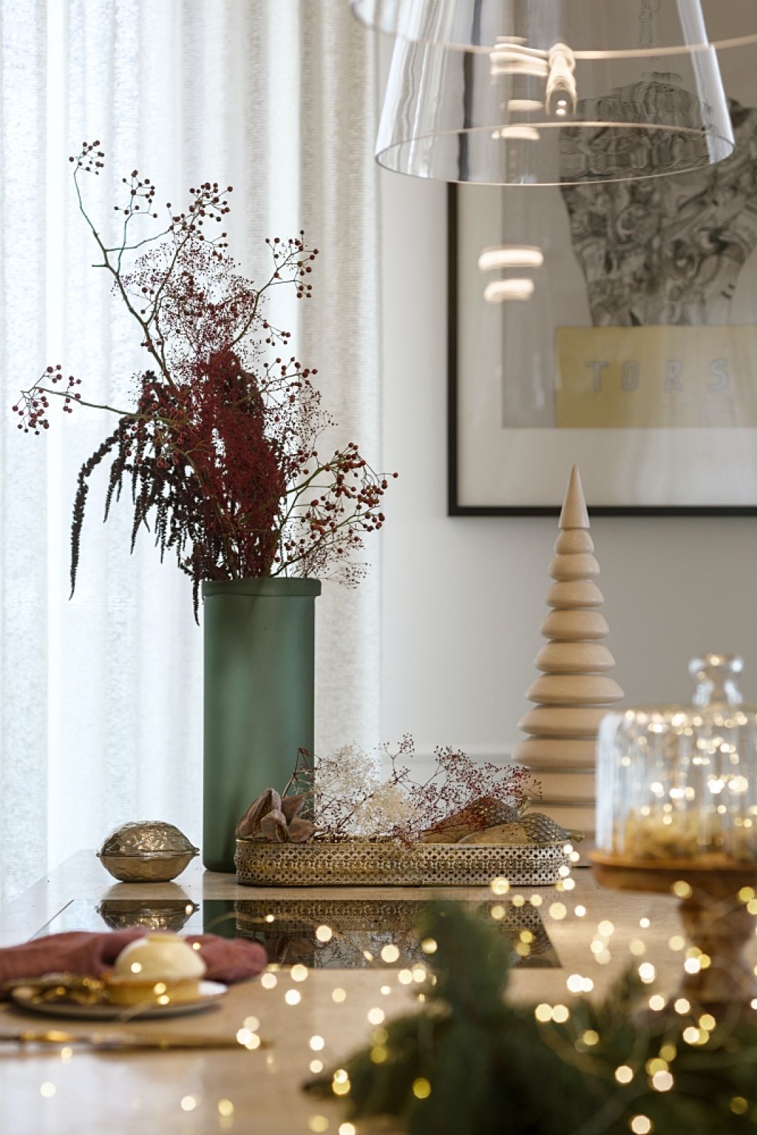 Na Boże Narodzenie w mieszkaniu pojawiły się zielone i fioletowo-złote ozdoby, a także migoczące lampki, które wypełniają przestrzeń świątecznym blaskiem. Subtelne dekoracje przywodzą na myśl bliskość z naturą. Gęsta, pachnąca choinka dumnie prezentuje się w centralnym punkcie salonu, wprowadzając magiczną atmosferę.