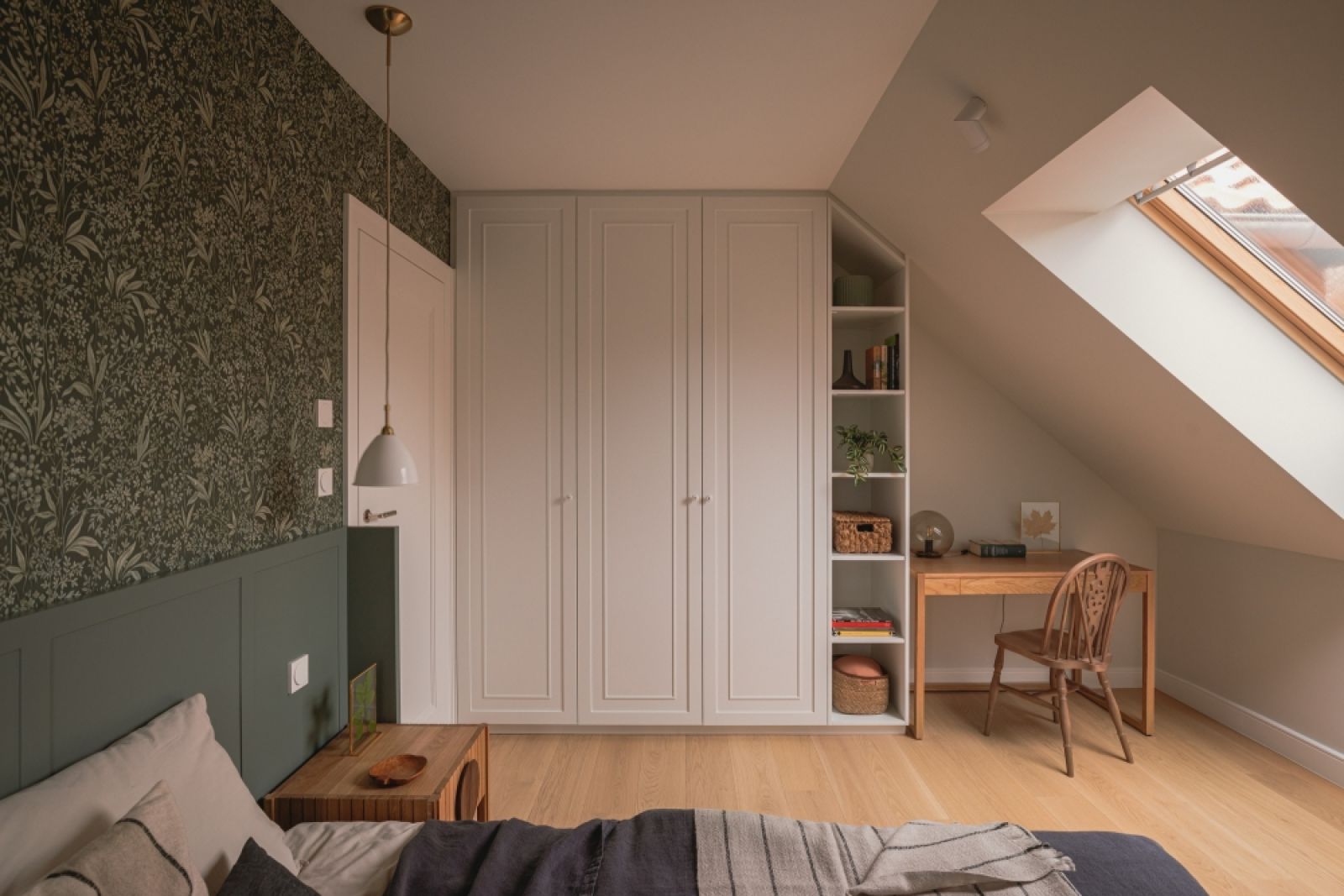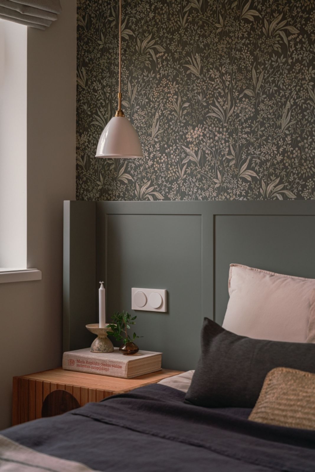Rolę nietypowego zagłówka pełni zielona boazeria odsunięta nieco od ściany i wykończona po bokach skrzydłami, które otaczają łóżko czyniąc z niego przytulne gniazdko. Wygląda to efektownie, tym bardziej, że na ścianie powyżej położono dekoracyjną tapetę w roślinny wzór. Nad dwie szafeczki spuszczono symetrycznie kultowe abażurki znanej skandynawskiej marki. Lampki po zmroku dają nastrojowe kameralne światło ocieplając pięknie zaaranżowaną przestrzeń.