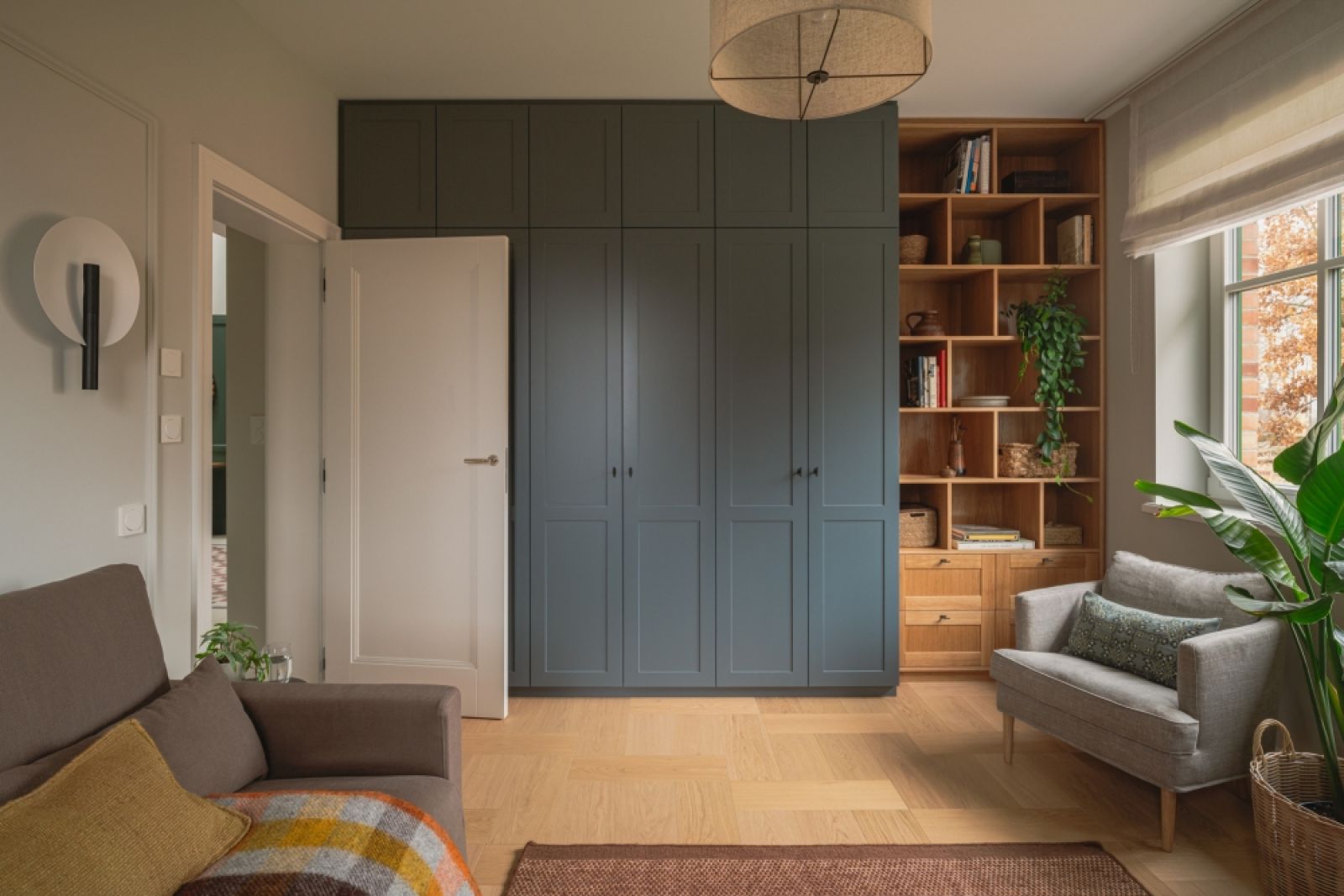 Mebel wypoczynkowy stanął tuż obok biblioteki a właściwie dużej, na całą ścianę, szafy. W jednej części, za frontami w kolorze gołębiej szarości, znajduje się miejsce na przechowywanie sezonowej garderoby, w drugiej, odkrytej – zaaranżowano półki na księgozbiór, który cały czas się powiększa.