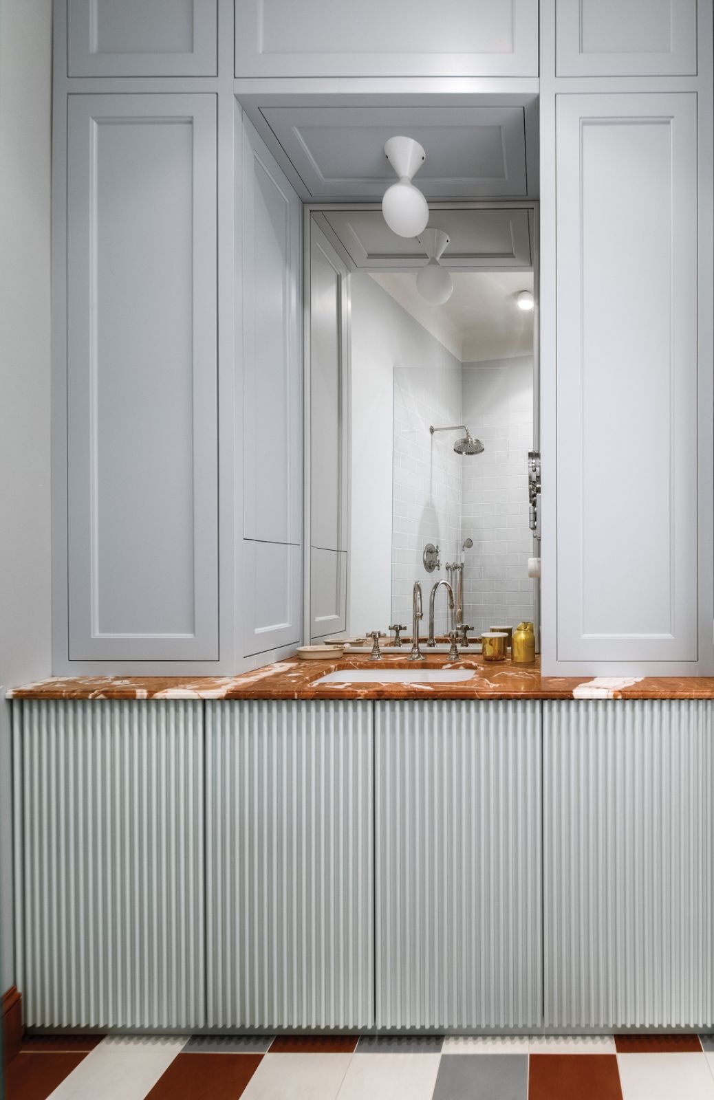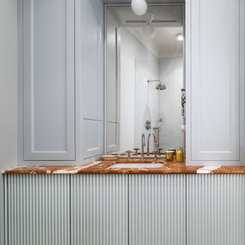 Pierwszy pomysł to było całkowite szaleństwo – weneckie łuki, szklane ściany i ogromny pokój kąpielowy z wanną pośrodku. Nie wytrzymał jednak próby czasu. Kiedy za długo miała czekać na płytki, przypomniała sobie o marmurze, który leży w piwnicy, bo został po jakimś remoncie. Przymierzyła go i okazało się, że pasował nad kuchenny blat co do centymetra.