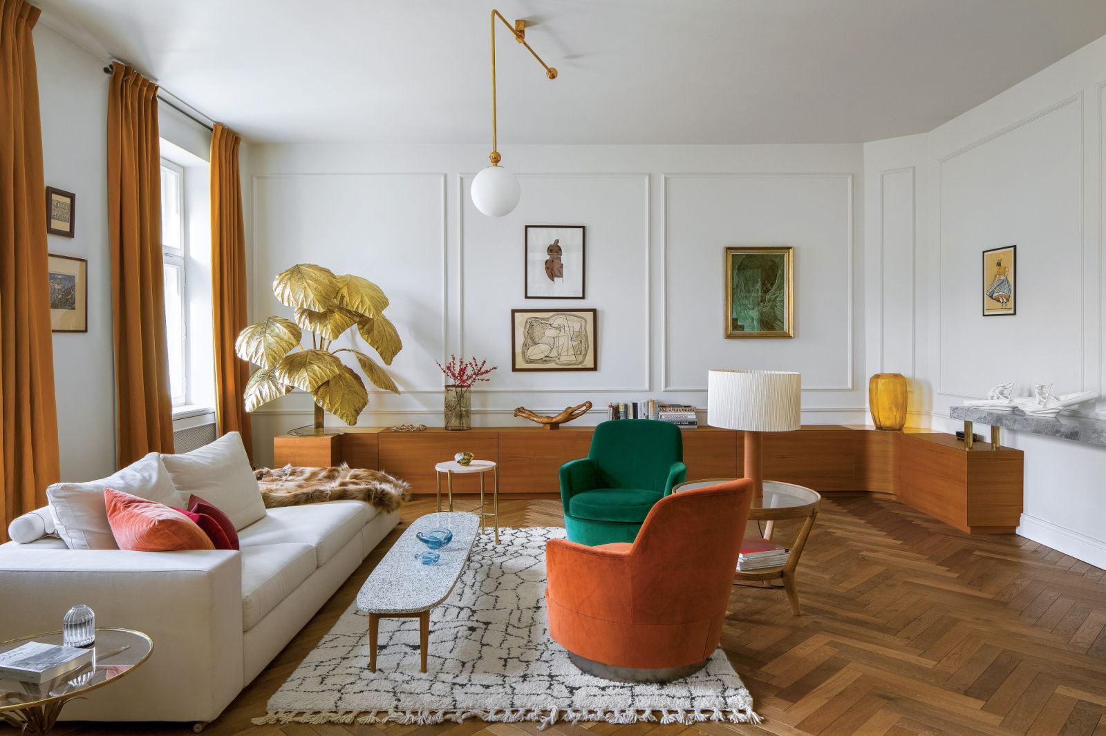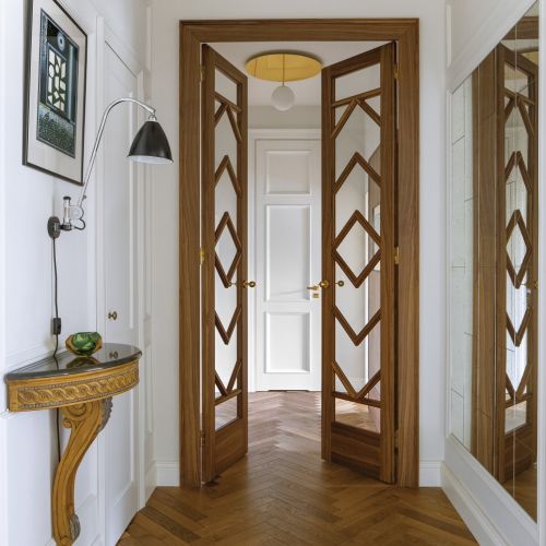 Gdy zabrakło sztukaterii, postanowiła po prostu ułożyć je inaczej i okazało się, że jest lepiej. Bez problemu udało się przenieść kuchnię i połączyć z salonem, a w jej miejscu powstał gabinet. Podczas wymiany okien pomocne okazały się przedwojenne rysunki techniczne, które projektantka znalazła w administracji. Teraz ma okna takie, jakie były tu przed wojną – skrzynkowe, z mosiężnymi okuciami.