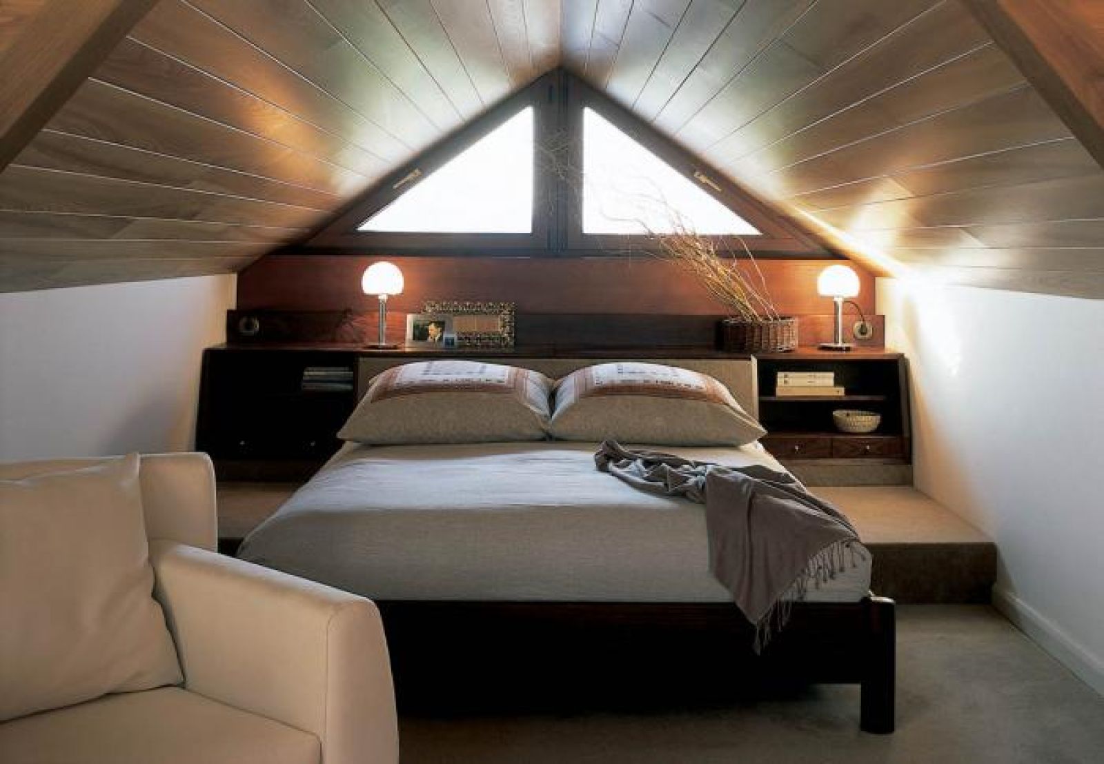 Sypialnia, choć urządzona w ascetycznym japońskim stylu, też jest bardzo przytulna. No, ale kto nie lubi spać na poddaszu?