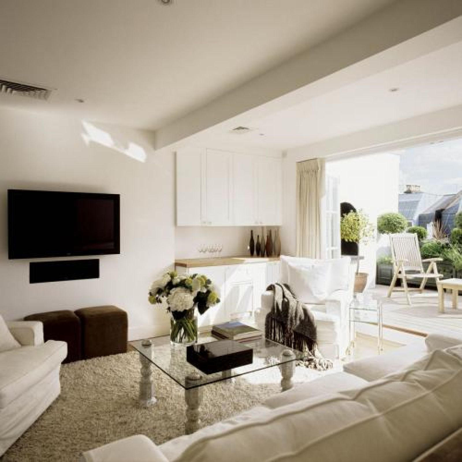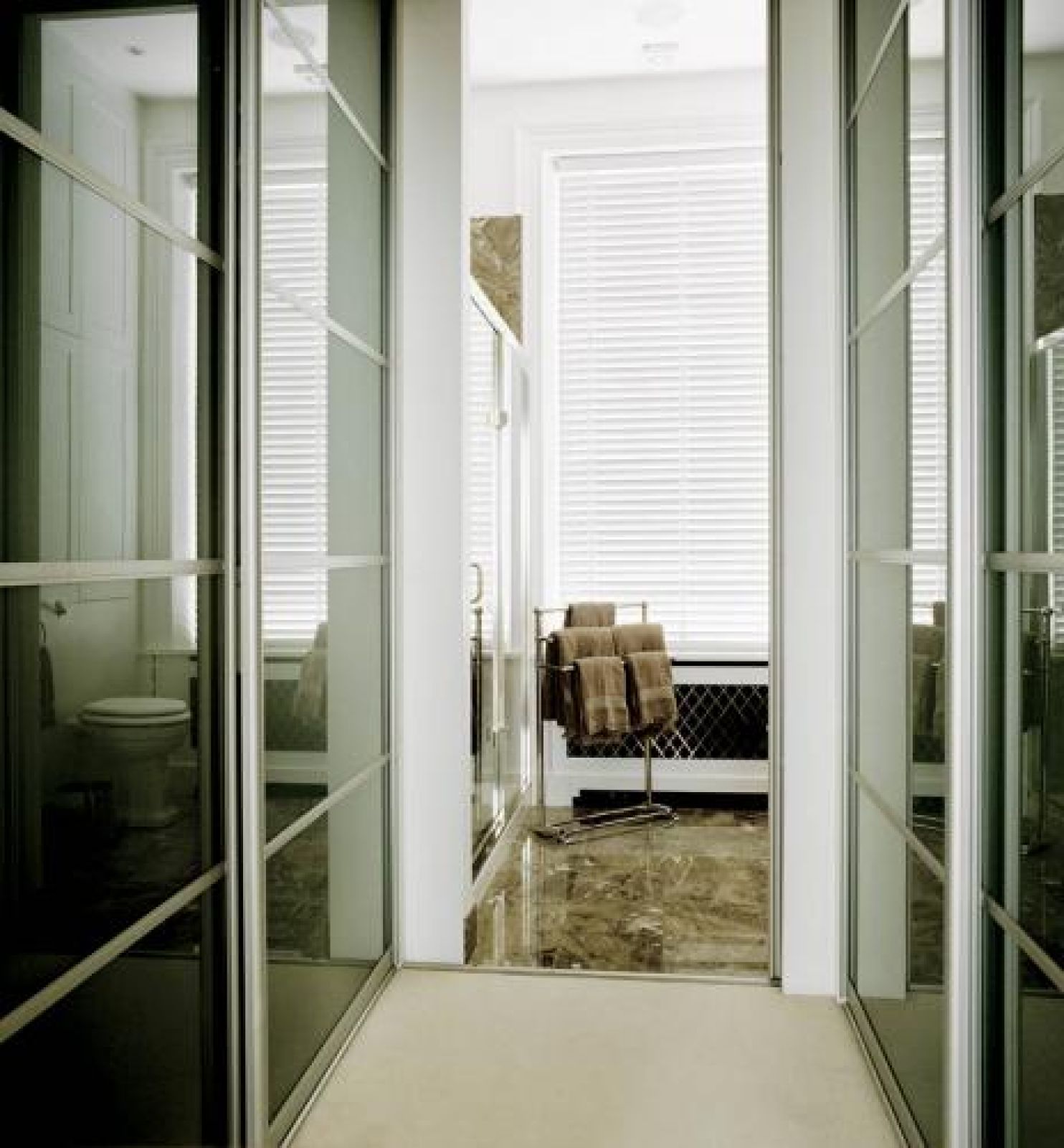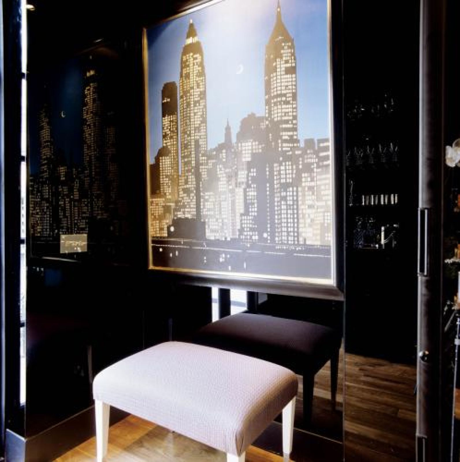 W sypialni gości stanął zaprojektowany przez architekta lustrzany parawan. Na jeszcze ciekawszy pomysł Gradey wpadł w jadalni, gdzie zrobił „dramatyczny drink-bar” z czarnych luster. W kubik wstawił kredens, dorobił mu ciemny marmurowy blat, zamontował zlew, a zamiast tradycyjnej nadstawki dobudował półki ze szkła.