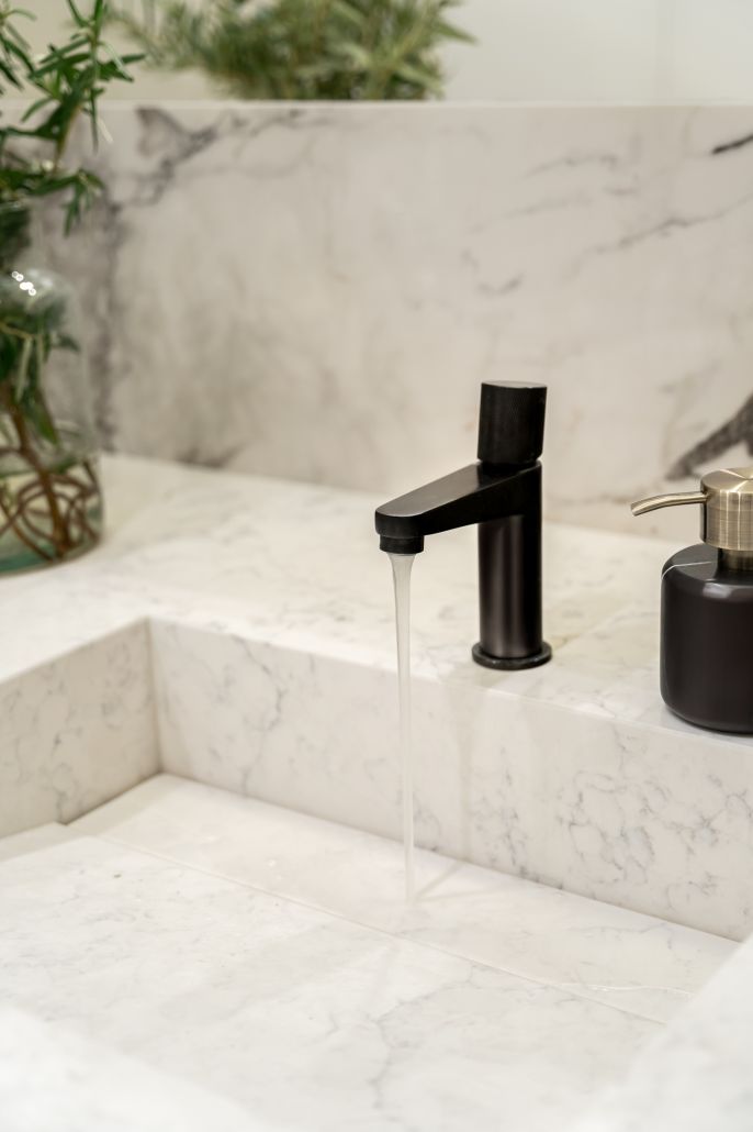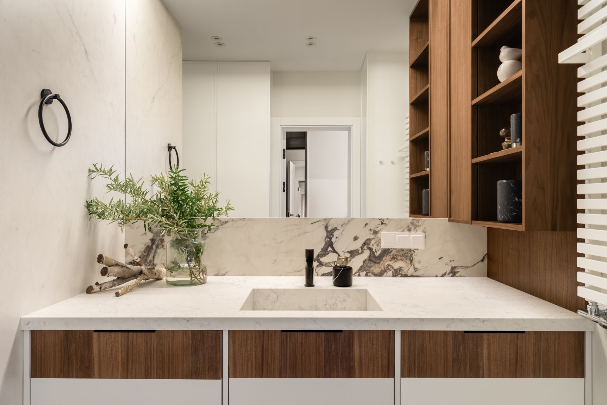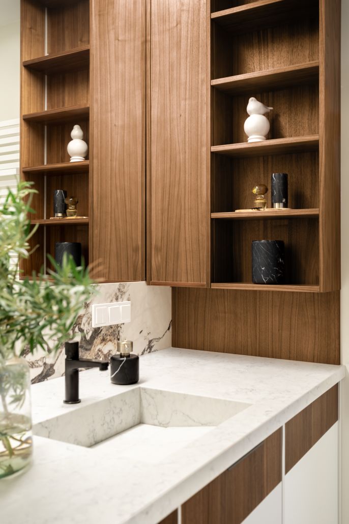 Znaleźć odpowiednią wpuszczaną w ten blat umywalkę nie było łatwo, dlatego Renata zdecydowała się na umywalkę szytą na miarę – zaprojektowała ją, a wykonanie zleciła kamieniarzowi. Wygląda nowocześnie i bardzo elegancko. Ten efekt wzmacniają fronty za którymi kryje się AGD, wykończone drewnem. Stolarz zabejcował je tak, że górne fragmenty frontów wyglądają jak ze szlachetnych odmian fornirów.