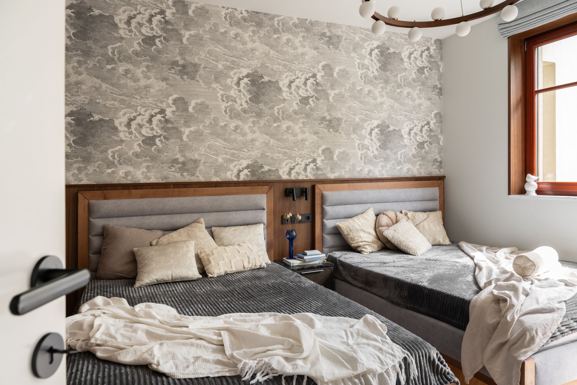 Nie tylko salon może się poszczycić efektowną tapetą – inna, równie efektowna graficznie jak ta w salonie, zdobi sypialnię. Na całej szerokości jednej ze ścian, ponad zagłówkami łóżek, ciągną się pchane wiatrem obłoki. To klasyk z kolekcji słynnej tapeciarskiej marki Cole & Son.