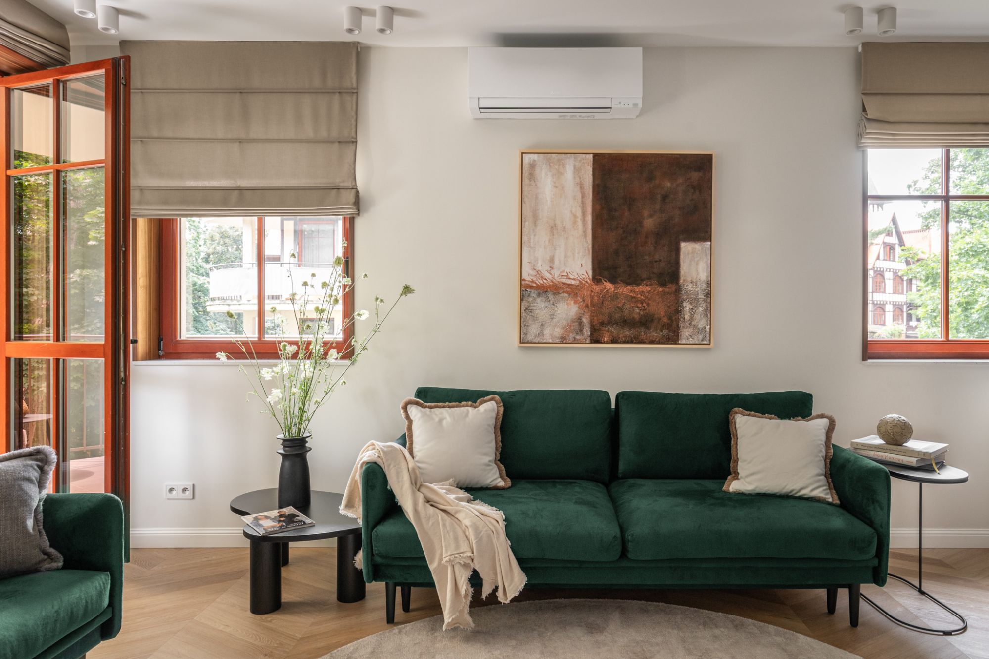 Intensywnie zielone sofy w salonie były sugestią właścicielki i świetnie komponują się z zielenią za oknami. W lecie salonowe rozmowy przenoszą się na balkon i z tego względu musiał on zostać odświeżony. Balustrady wyczyszczono i pomalowano na nowo, podobnie ściany wokół okna balkonowego. Fotele, które wybrano na balkon, są bardzo wygodne i miękkie. – Pani Ewa świadomie zrezygnowała z firan i zasłon na rzecz nowoczesnych rolet, co pozwala w pełni wykorzystać naturalne światło, jednocześnie zapewnia intymność, gdy jest potrzebna. Moskitiery skutecznie chronią przed owadami, nie zakłócając przy tym widoku za oknem – mówi architektka.