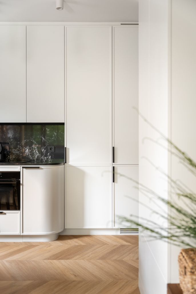 Pani Ewa chciała, żeby mieszkanie było proste i eleganckie, a jednocześnie ponadczasowe – miało dobrze służyć przez całe następne lata. Oznaczało to, że materiały wykończeniowe muszą być trwałe, a do tego dobrze dobrane, estetyczne. Sama mocno zastanawiała się nad podłogą, bo każdy woli widzieć na niej naturalne drewno. Tymczasem klepka parkietowa była nie tylko droższym rozwiązaniem, ale i bardziej wymagającym. Tam, gdzie łatwo przynieść na butach piach i błoto, warto wybrać łatwo zmywalną, odporną na wilgoć i zarysowania podłogę winylową. Architekci zaproponowali panele dobrze naśladujące ułożony we francuską jodełkę drewniany parkiet.