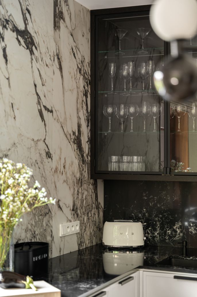 Właścicielka ma oryginalne upodobania, np. lubi ciemne i nasycone kolory. Chciała mieć w salonie czarną tapetę, dlatego w otwartej na niego kuchni projektanci rozjaśnili wnętrze kontrastową, białą zabudową. Chodziło o to, by nie pomniejszać optycznie całej strefy dziennej. Na blaty wybrano naturalny kamień – granit o dekoracyjnym żyłkowaniu, skontrastowany z wielkoformatowymi spiekami włoskiej marki Marazzi na ścianach, naśladującymi marmur. Duże płyty - poza walorem dekoracyjnym - zapewnianą minimalną ilość fug, które lubią się brudzić, zwłaszcza w kuchni.