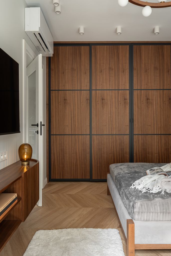 Sypialnia nie jest dużym pomieszczeniem i wykorzystano maksymalnie jej powierzchnię, by śpiące w niej osoby miały komfort. Przed generalnym remontem stały tutaj dwie rozkładane sofy, teraz są dwa wygodne łóżka z materacami. Pomiędzy nimi jest tylko wąskie przejście i stoliczek nocny wykonany przez stolarza na zamówienie. Tym, co ociepla wnętrze sypialni jest drewniany panel przypominający klasyczną boazerię oraz miękkie tapicerowane wezgłowia łóżek.