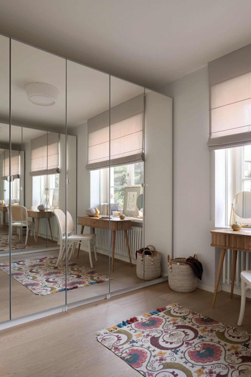 Nasze wnętrza w naturalny sposób nie są idealne, i to mi się w nich właśnie podoba. Lustrzana zabudowa w garderobie miała być tymczasowa, a została na dłużej, bo wciąż nie mam na nią pomysłu. Przyzwyczailiśmy się do tych luster i przydają się, kiedy ćwiczę jogę.