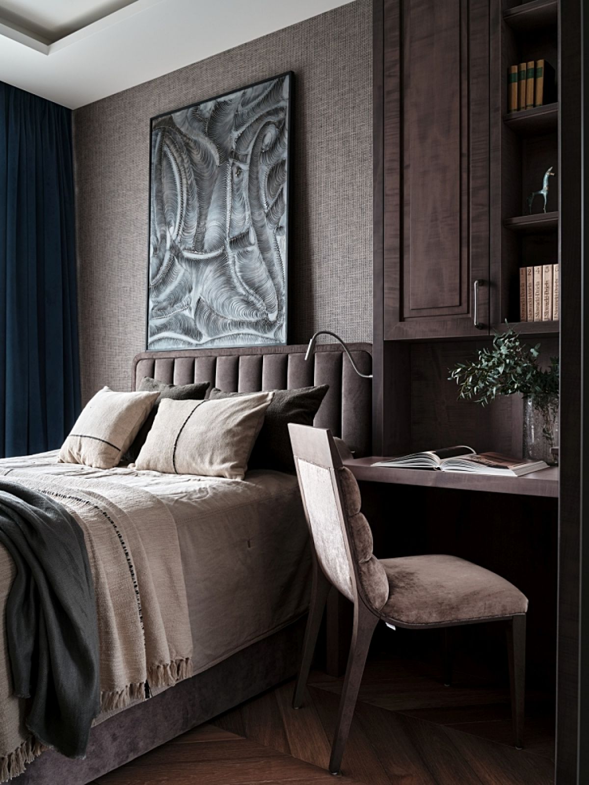 Naturalne światło pięknie wydobywa spójną gamę kolorystyczną mieszkania. Elegancki chłód szarości równoważą cieplejsze beże i odcienie drewna. W sypialni pani domu pojawia się róż na suficie, w pokoju jej męża – świeży duet indygo oraz ciemnego brązu. Dużą łazienką zawładnęły błękity, a toaletą duet czerni i bieli.