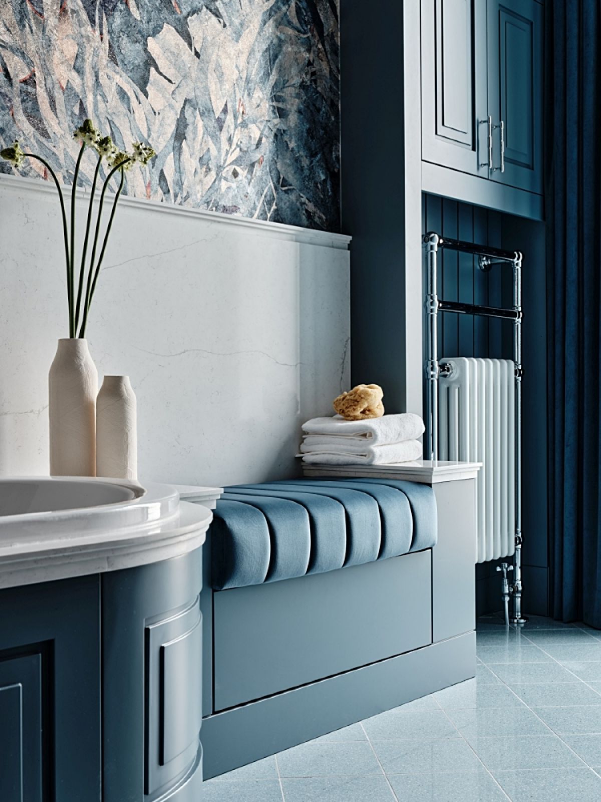 O tym, z jak wielką uwagą architekt tworzył szczegóły, świadczy półwysep kuchenny. Kończy się zaokrągleniem, któremu odpowiada nie tylko wyprofilowany gzyms blatu, ale też wzór kamiennej posadzki. Perfekcyjne wykonanie to zasługa użycia piły wodnej. Analogiczne rozwiązania pojawiły się w łazience, gdzie zabudowa z drewna i kamienia gięto-łamanymi liniami opisuje m.in. występ umywalki, owal wanny i blaty przy bankietce.